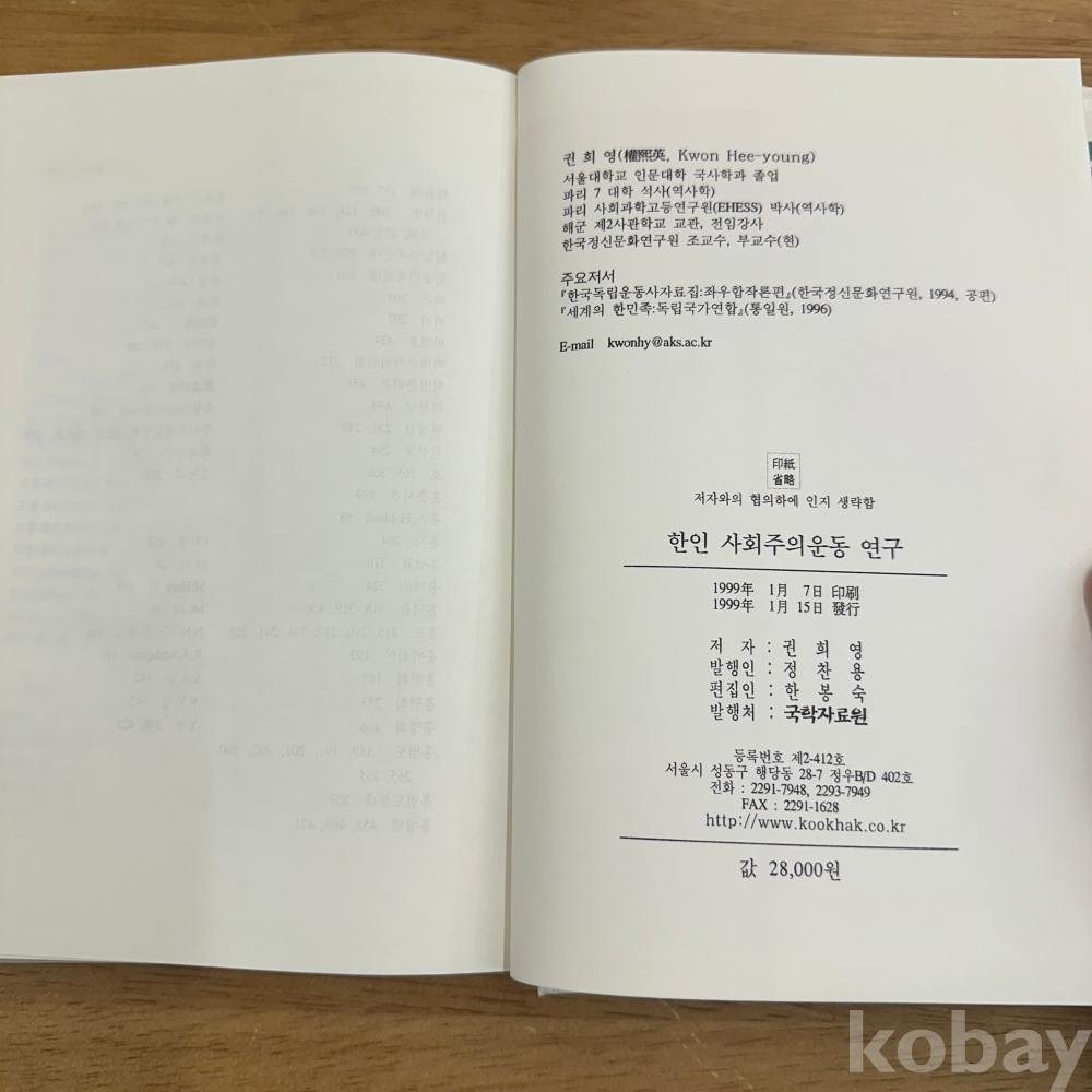 [한국근대사, 일제강점기, 공산주의] 권희영, <한인 사회주의운동 연구>, 국학자료원, 1999, p. 591, 상태 중급(사진참조)
