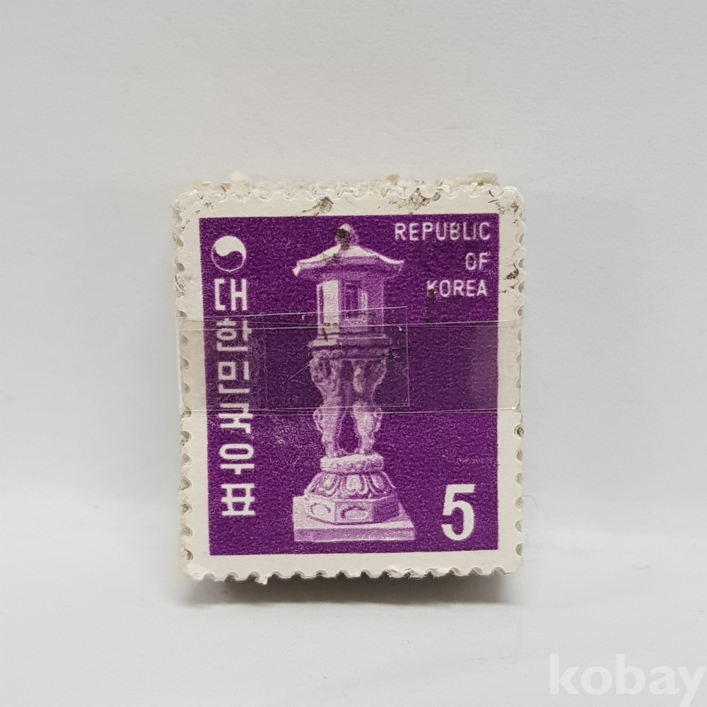 - 1969년 제 1차 그라비아 5원 쌍사자석등 일부인 미확인 사용제 우표 약 100매 묶음