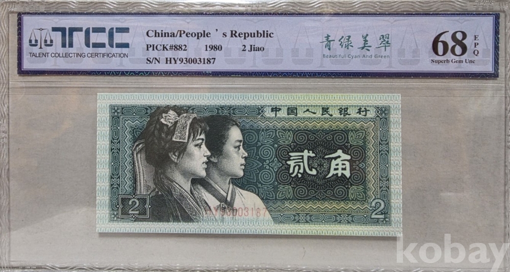 -1980년 중국 인민은행 발행 2각 지폐 TCC68 고등급 입니다.
