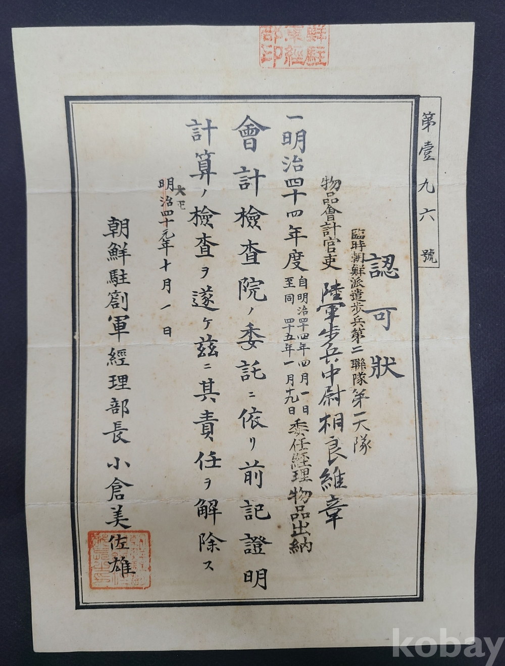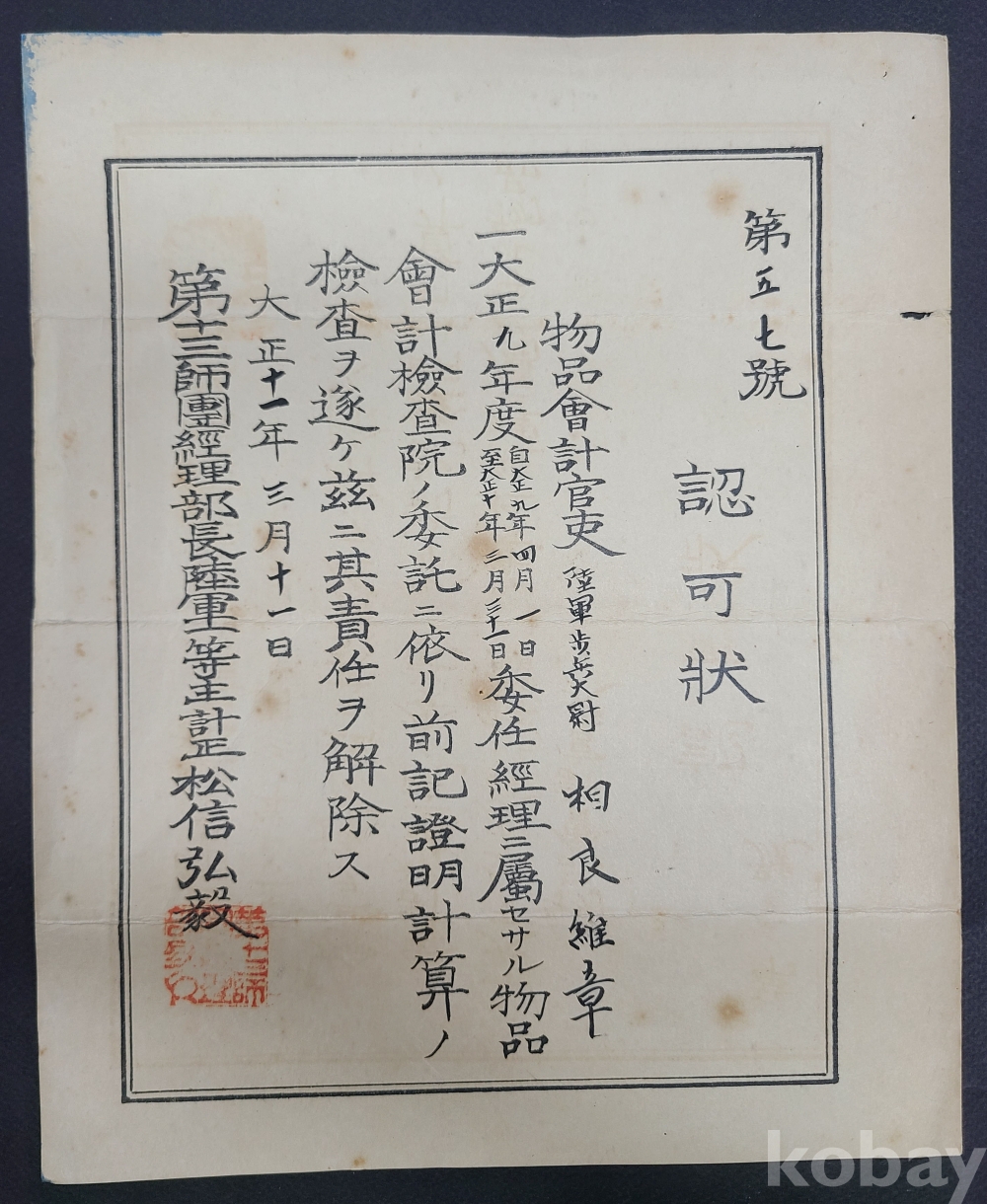**** 朝鮮駐箚軍 經理部長 명의로 발급된 認可狀 (대정원년)/조선주둔 일본군 제13사단경리부장 명의로 발급된 認可狀 (대정11년)