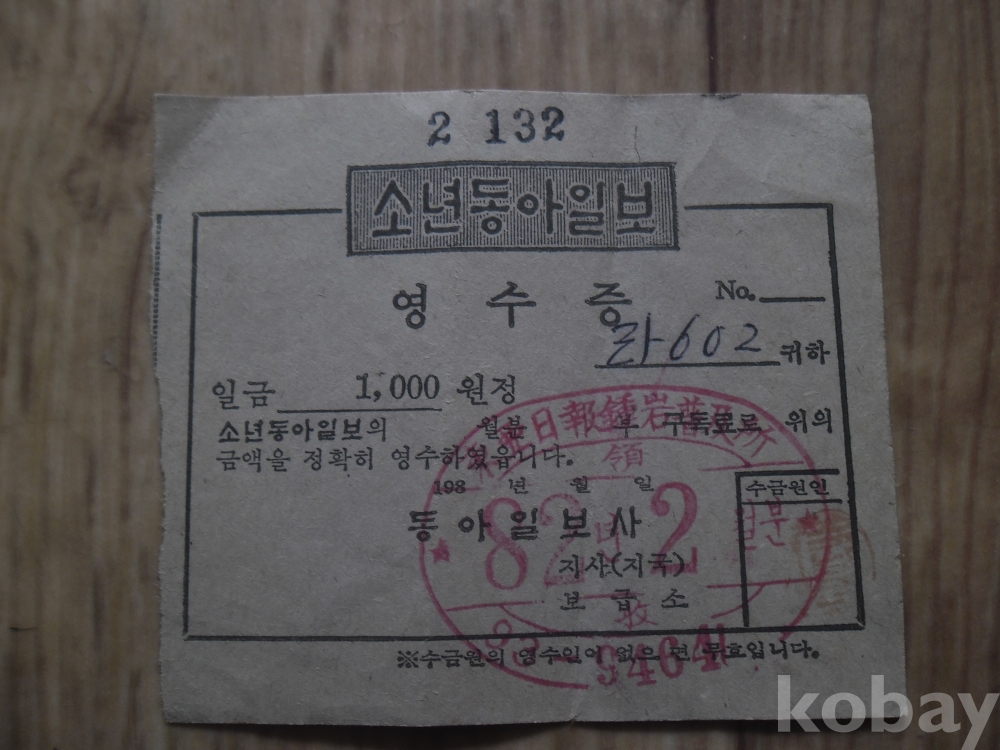 1982년 1000원 시기 소년동아일보 구독료영수증