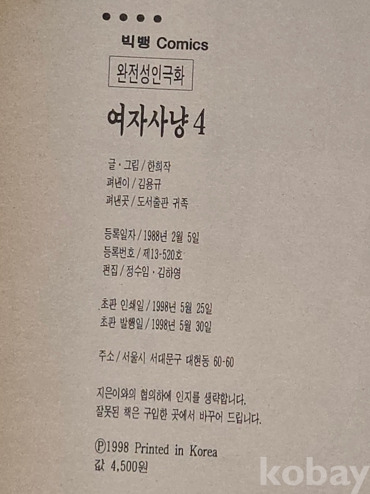 완전 성인 극화 == 여자사냥 4책 완질 = 한희작 ==오늘 처음으로 남자 앞에서 옷을 벗었다.