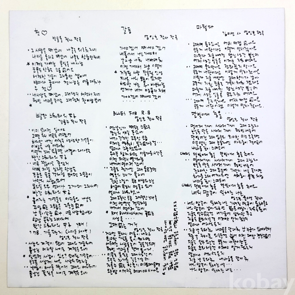 상 태 | 훼손 및 오염 정도 : SS, M, M -, NM + -, EX + -, VG + -, G, PP (상세하게 상태를 표기합니다) 사진 참고 부탁드립니다. / 자켓 : EX + / 음반 : EX + / 가사지 : 있음 (자켓뒷면) |