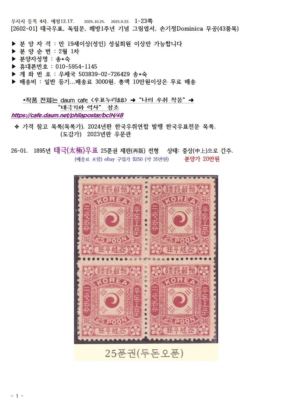 1895년 태극(太極)우표 25푼권 재판(再版) 전형 상태: 중상(中上)으로 간주.