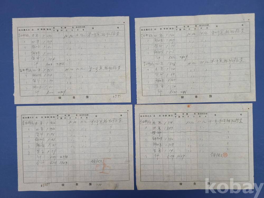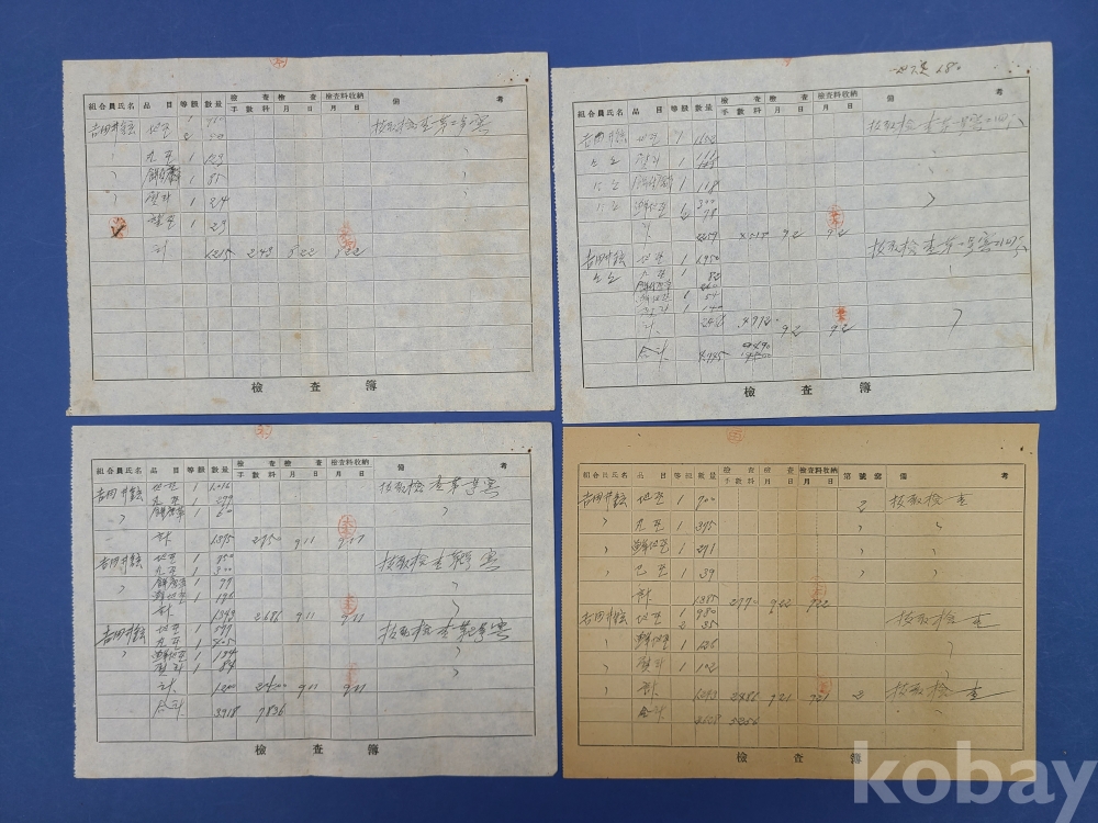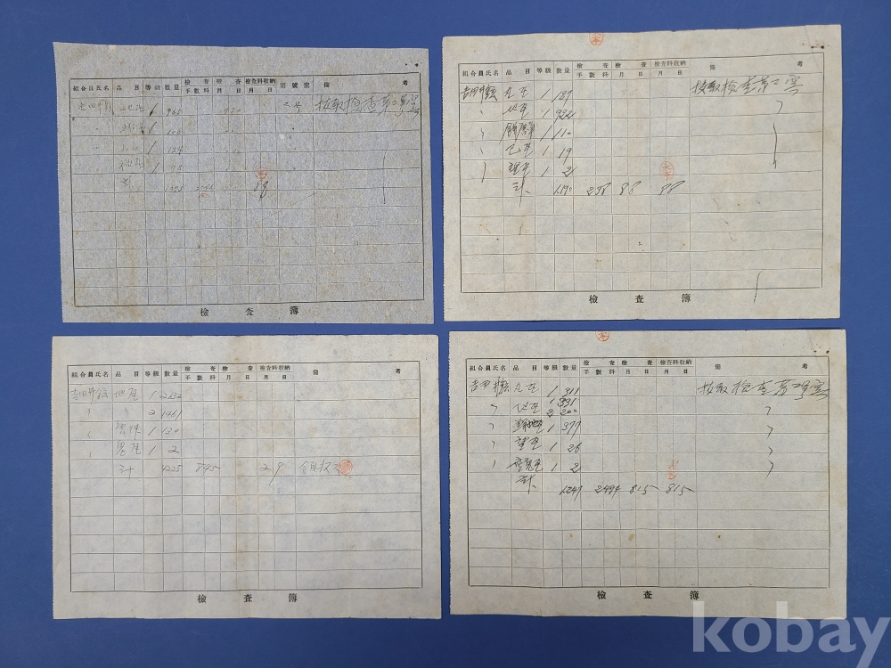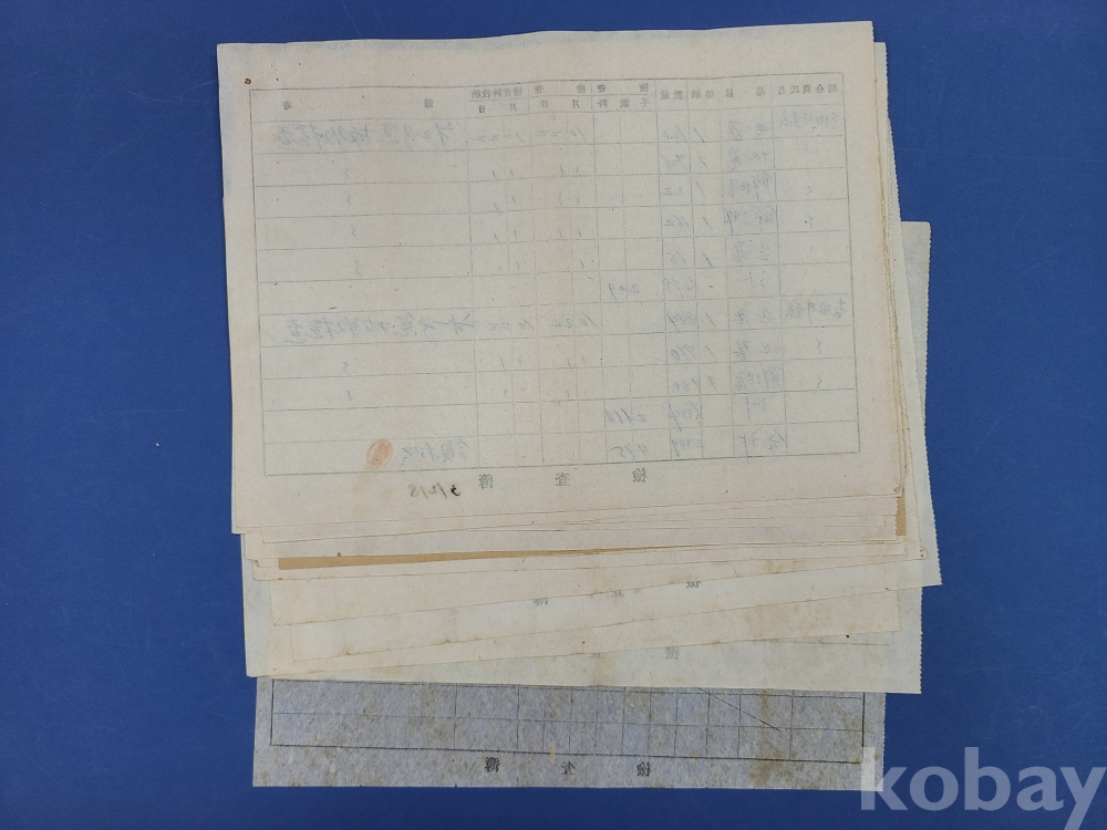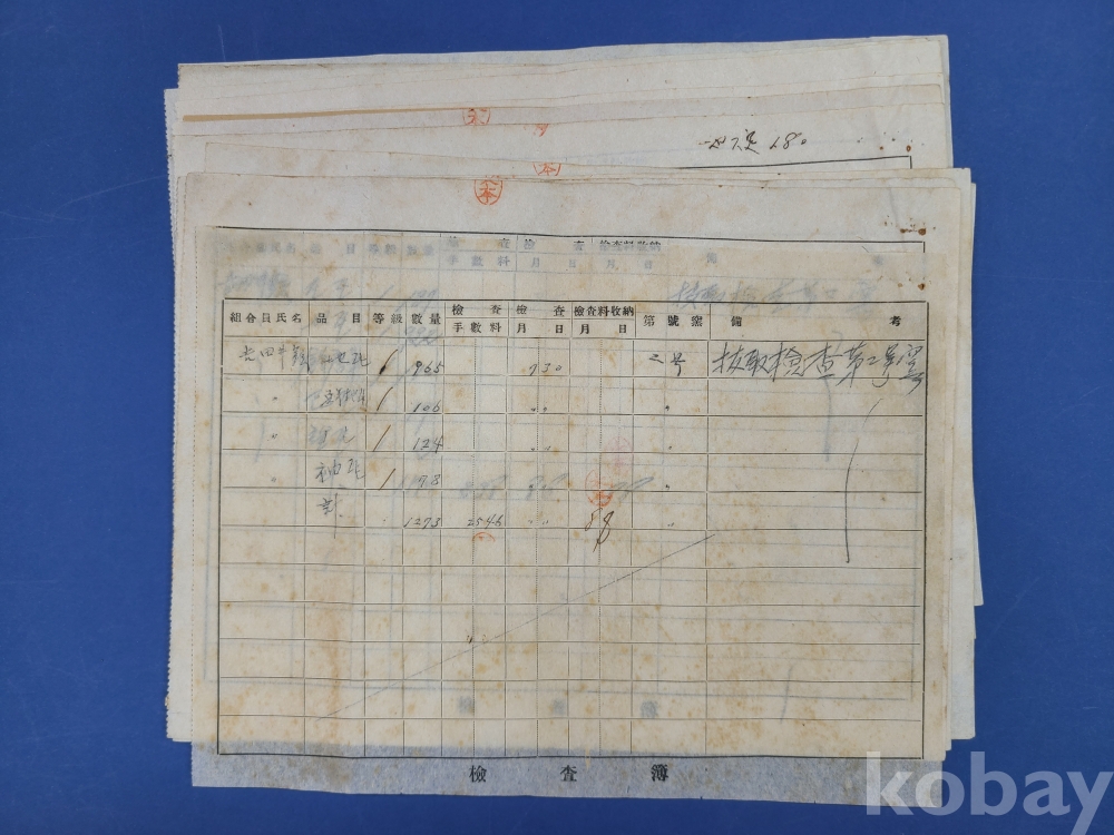 일제강점기 기와 檢査簿 12부*地瓦 丸瓦 鮮地瓦 등이 표기되고 조합원씨명,품목,등급,수량,검사,검사수납부 등의 내용이 쓰여져 있다