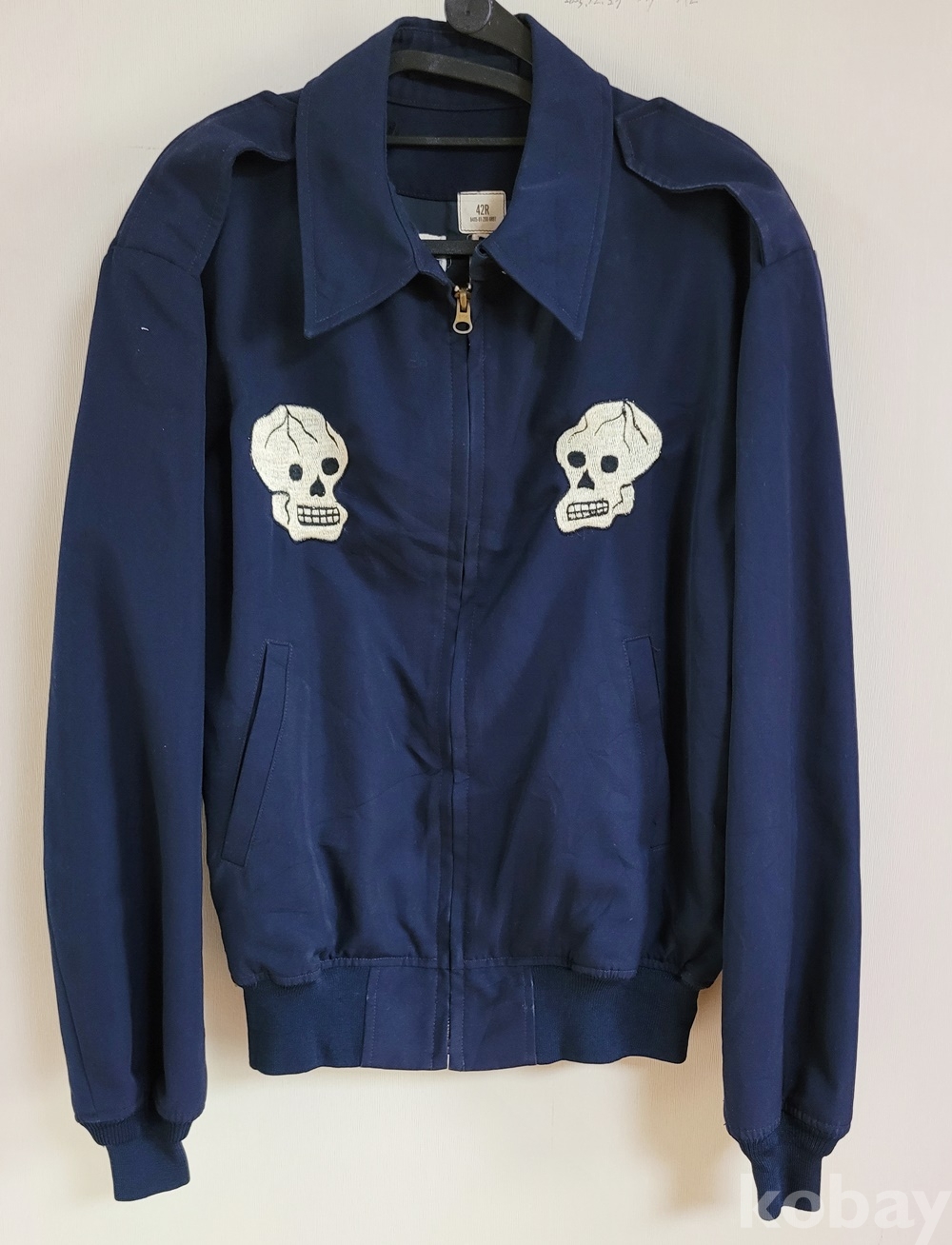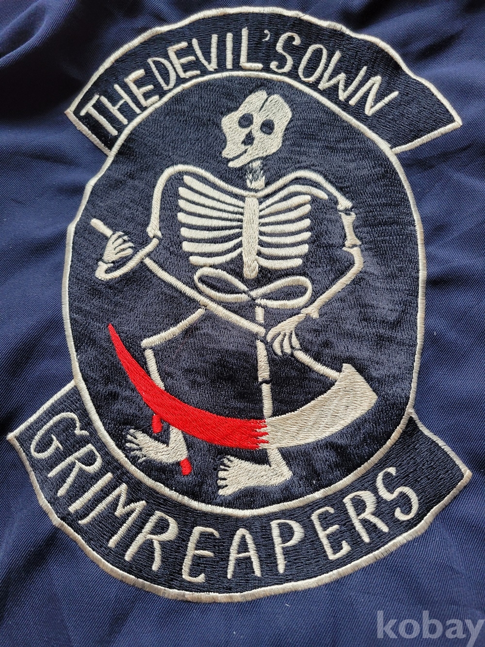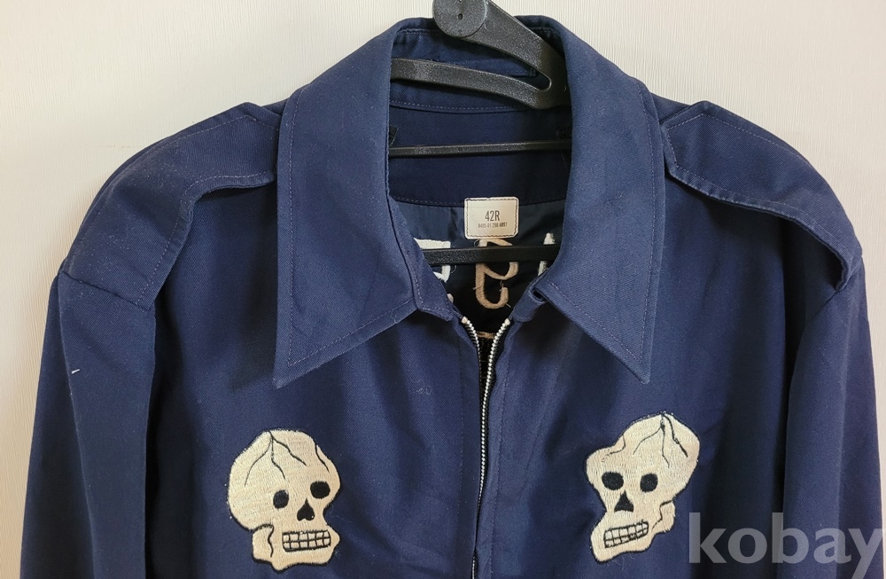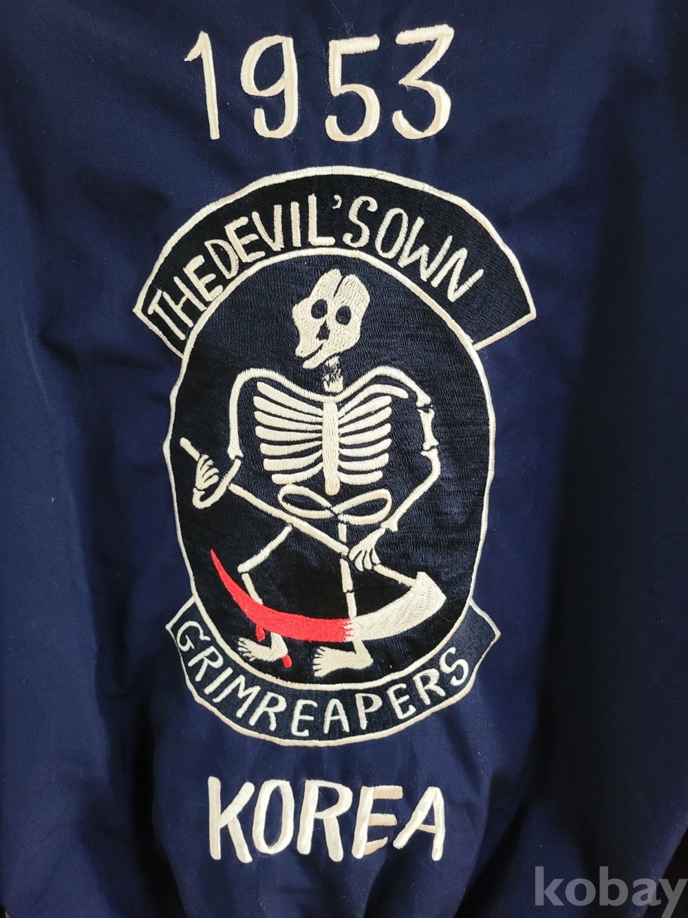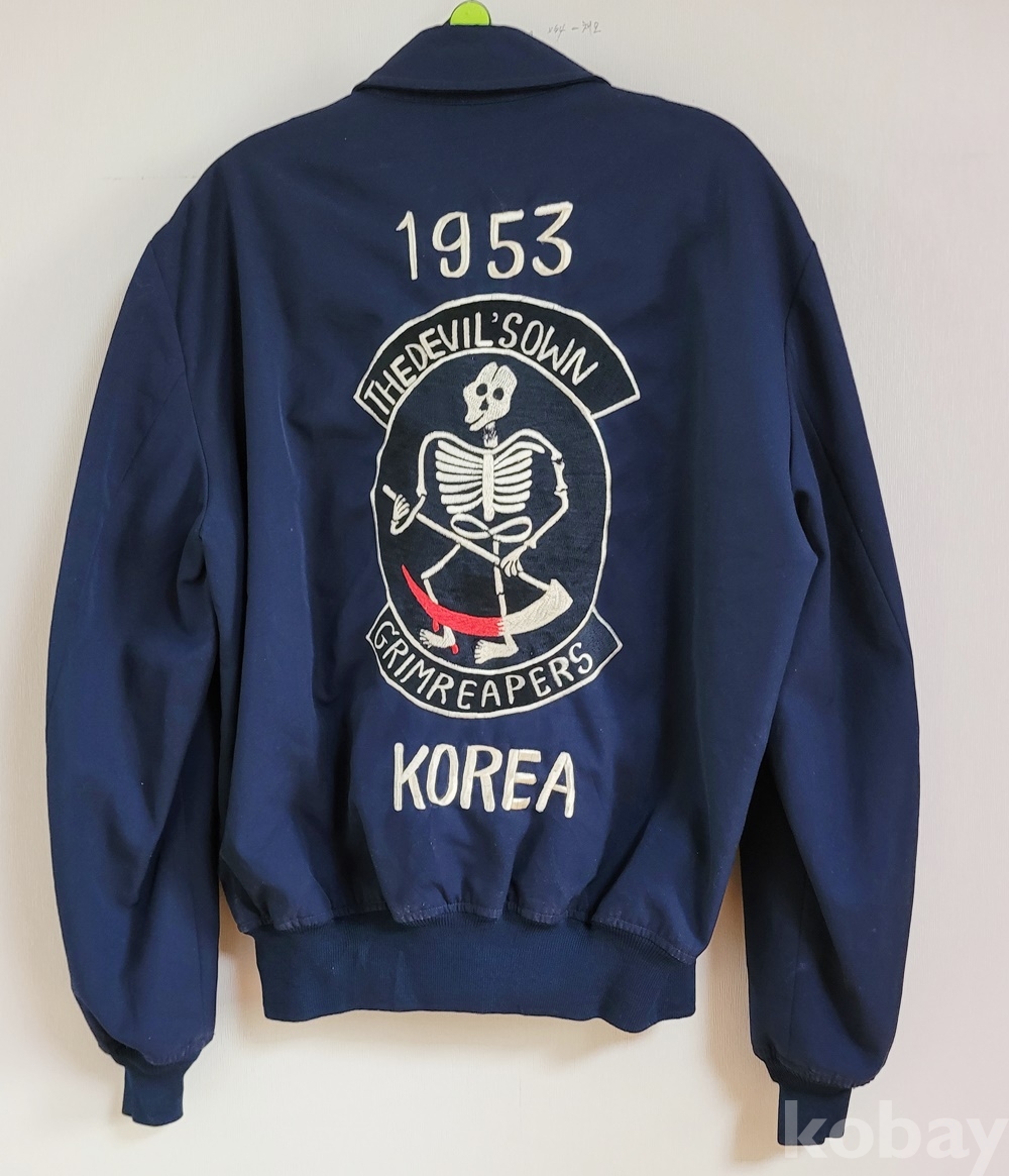 등쪽에 죽음의 신(또는 저승사자)“1953 THE DEVVIL’ SOWN GRIMREAPERS KOREA” 앞면에 인골이 정교하게 수놓아져 있습니다.