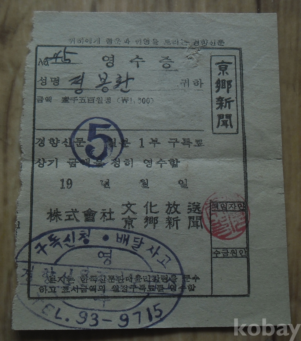 1500원 시기 경향신문 구독료영수증