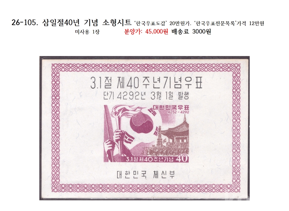 삼일절40년 기념 소형시트 ‘한국우표도감’ 20만원가. ‘한국우표전문목록’가격 12만원