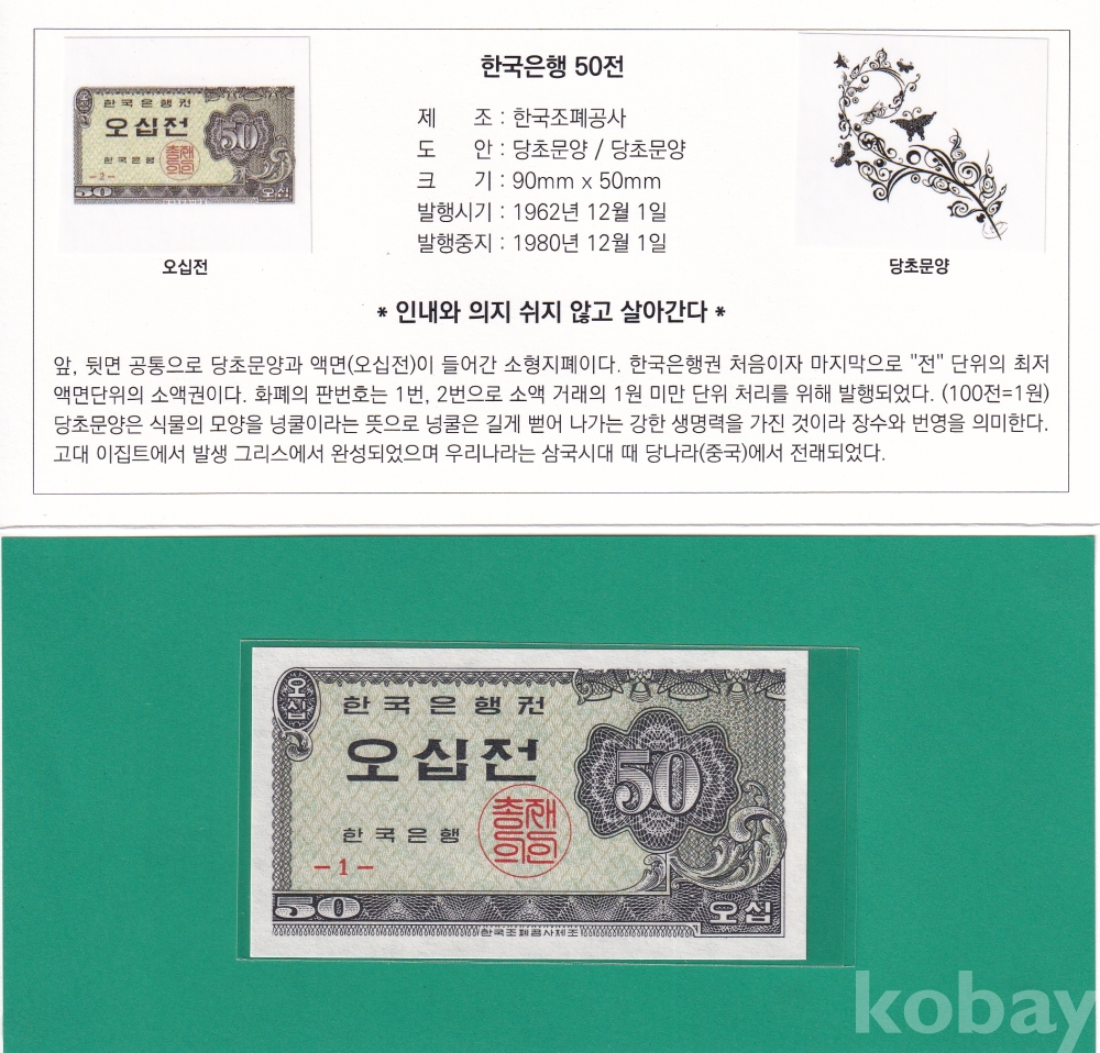 - 한국은행 1962년 소액 오십전 판번호 1번 미사용 지폐 - 화폐첩 포함