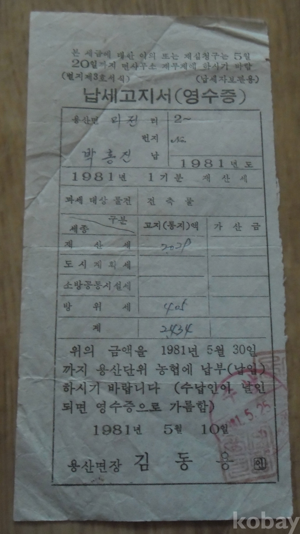 1981년 영동군 발행 재산세 납세고지서(영수증)