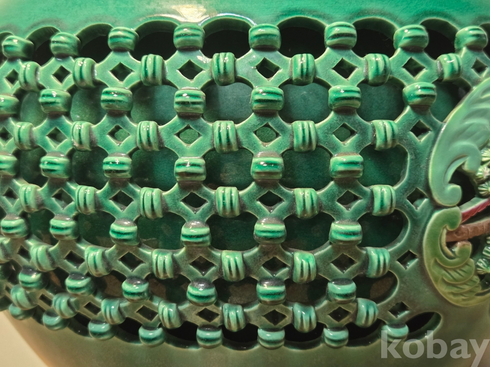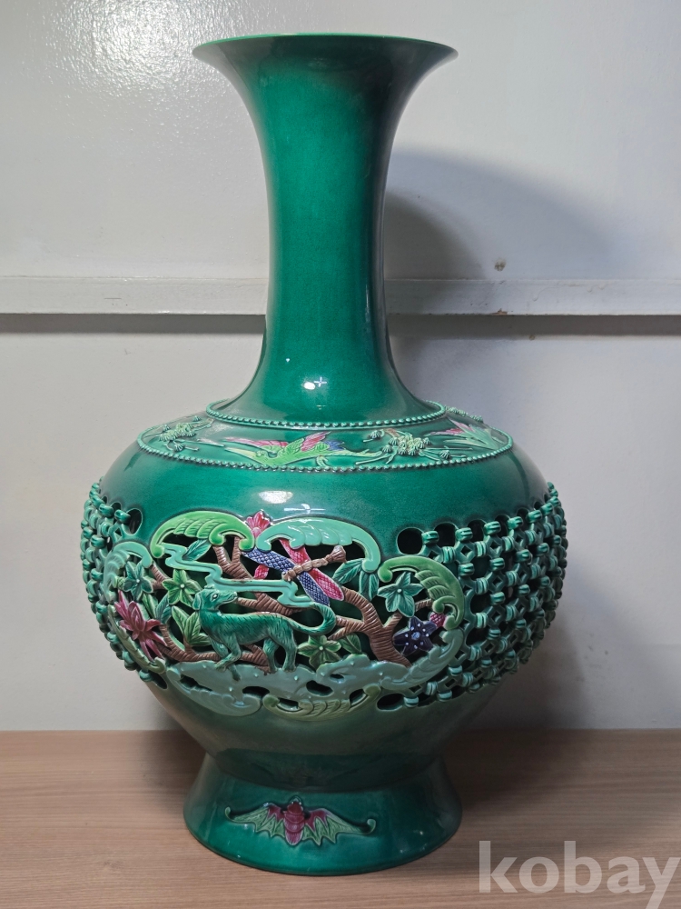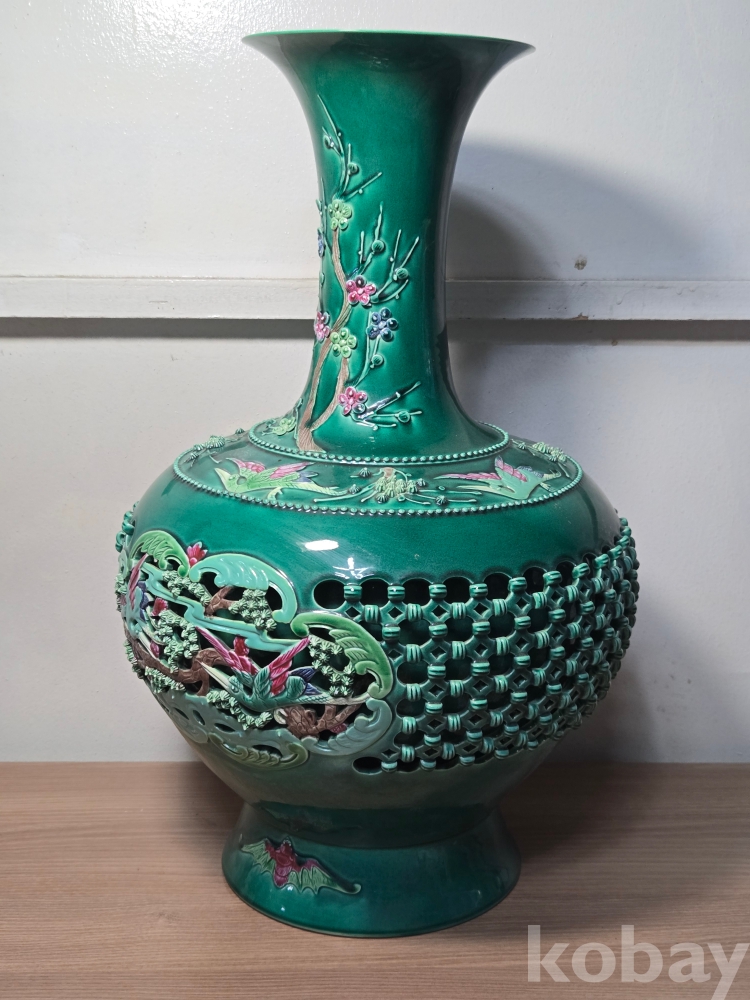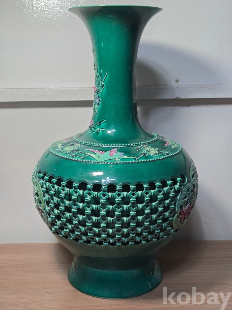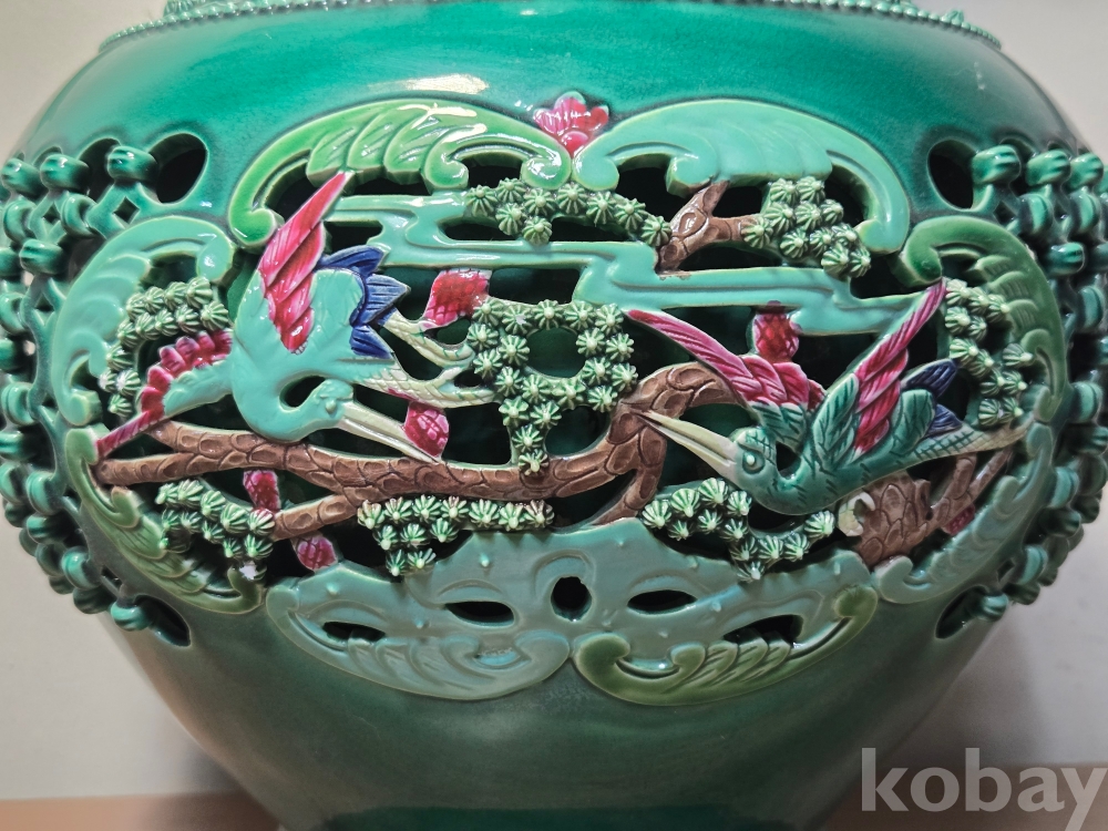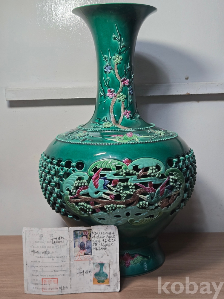 2006년 병술년 중국 경덕진 장명헌景德鎭長明軒 각인의 영롱유 화조문 투각자기입니다. 작가 친필의 도자기 인증서 포함.