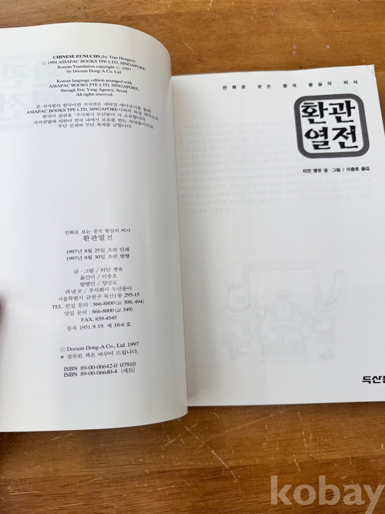 [중국사, 환관, 내시의 역사] 티안 헹유 글&그림, 이충호 옮김, <만화 중국황제 비사 : 환관열전>, 두산동아, 1997, p. 216, 상태 하급(뒤쪽이 휘어짐, 사진참조)