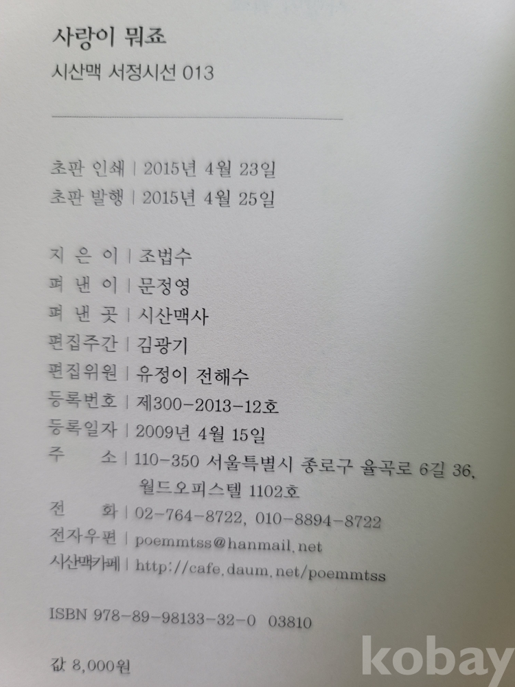 시산맥사에서 '시산맥 서정시선[013]'으로 발행.