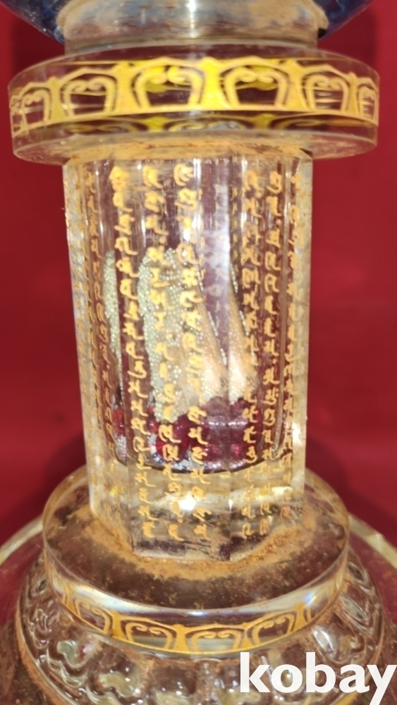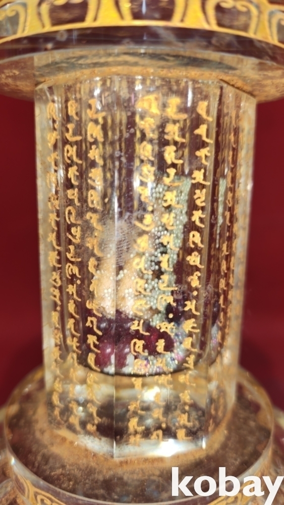 목선에 8각에는 세로로 불교용 범어(梵語)가 음각으로 새겨져 있는 공력이 많이 가미된 특별한 사리함입니다, 목선에 8각 내부에는 사리가 들어 있어서 눈에 보입니다,
