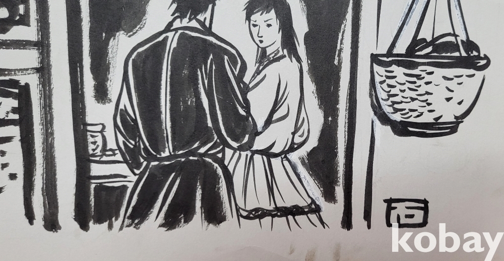 물과 먹으로 만 직접 그려진 수묵화 삽화입니다,