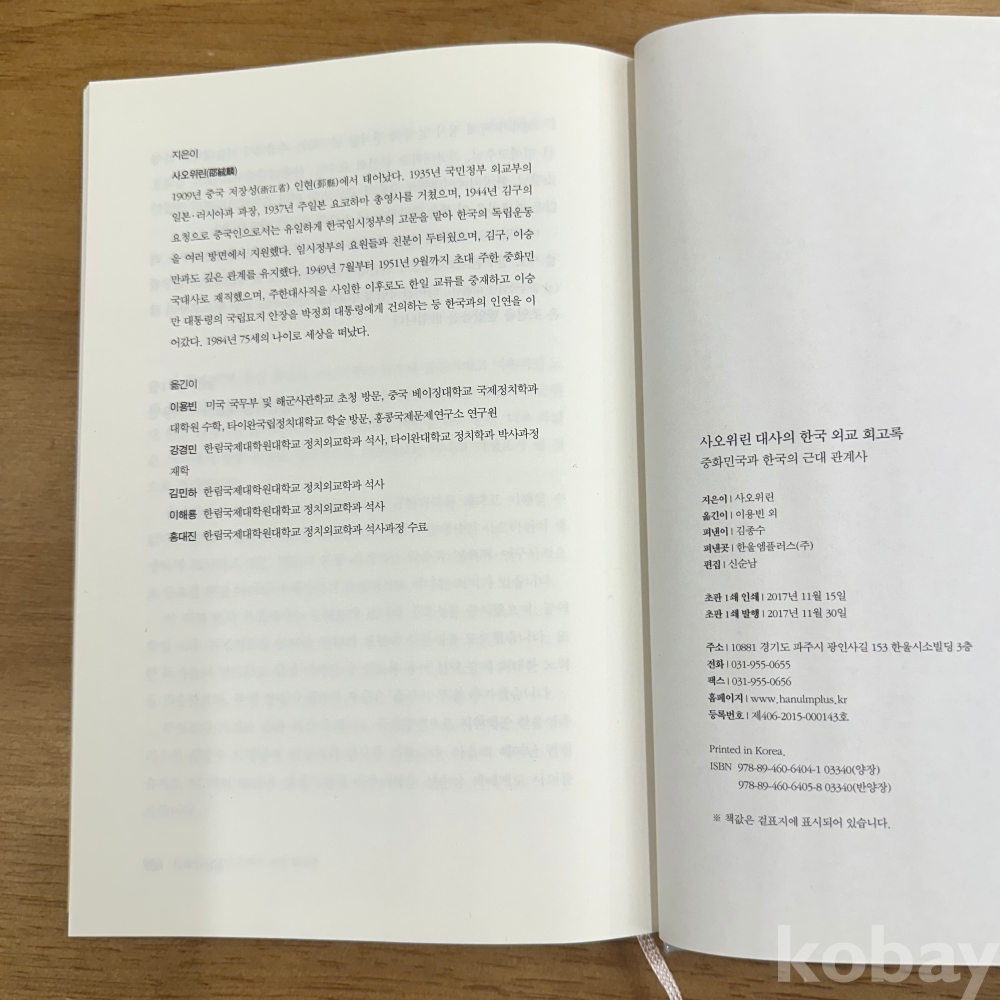 [한국현대사, 대만관계, 정부수립] 사오위린 저, 이용빈 외 옮김, <사오위린 대사의 한국 외교 회고록 - 중화민국과 한국의 근대 관계사>, 한울, 2017, p. 669, 상태 중급(사진참조)