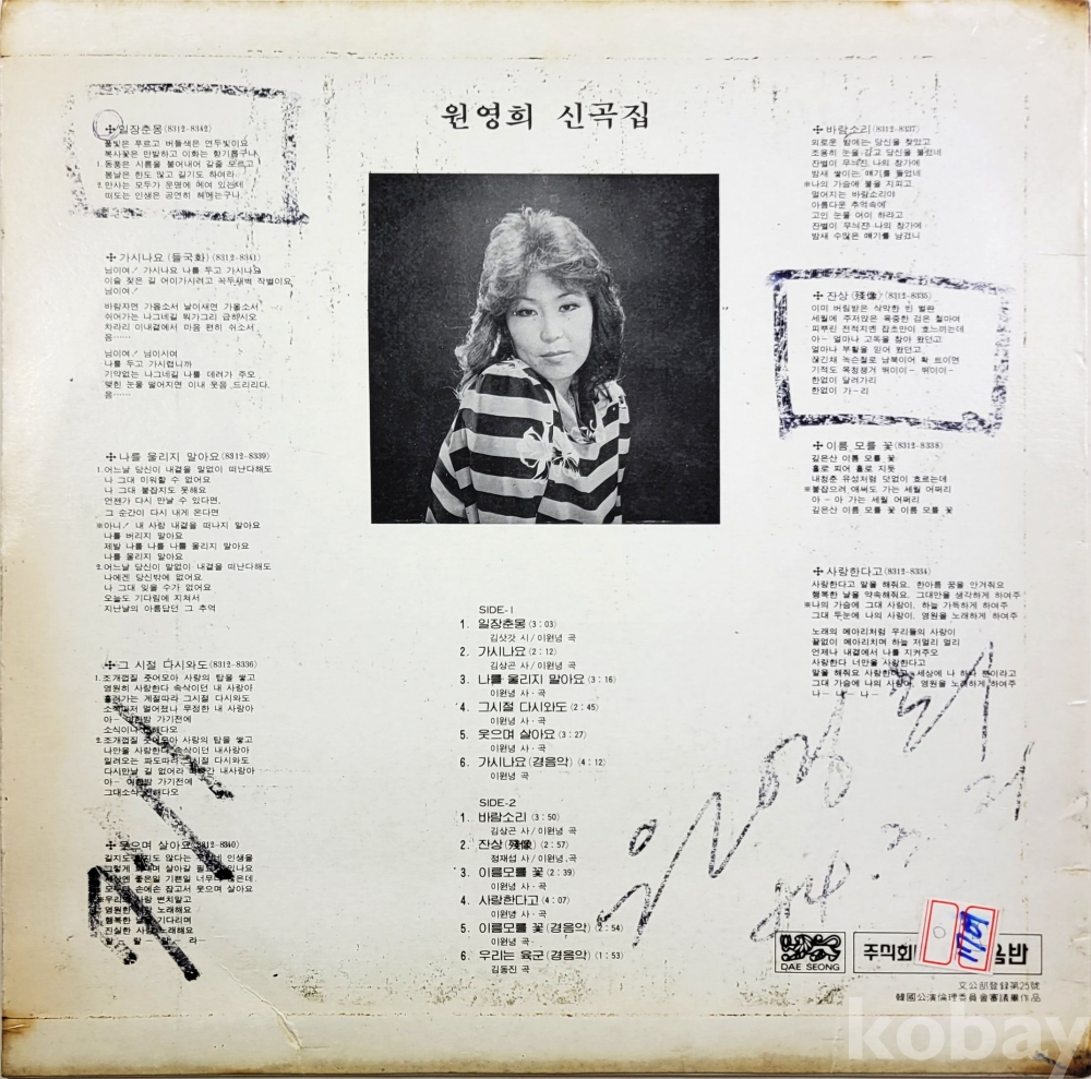 | 자켓상태 | VG : 주름, 접힘, 모서리 찢김 다수 | 음반상태 | VG : 생활 기스 다수, 가벼운 노이즈 존재 | 발매정보 | 초반 | 가사지여부 | 유 |
