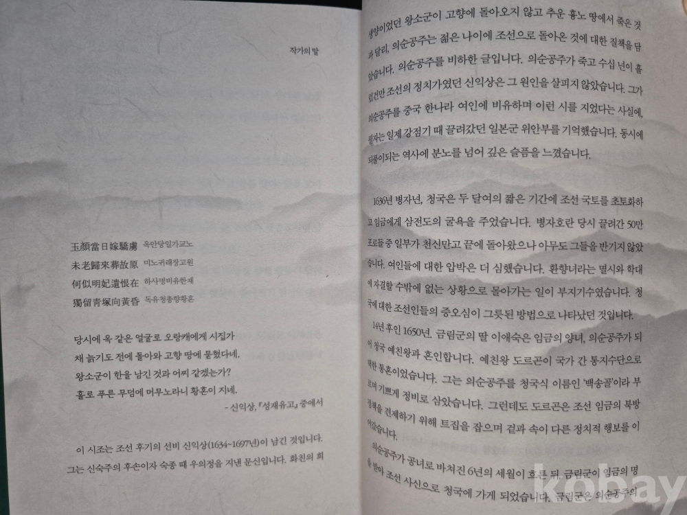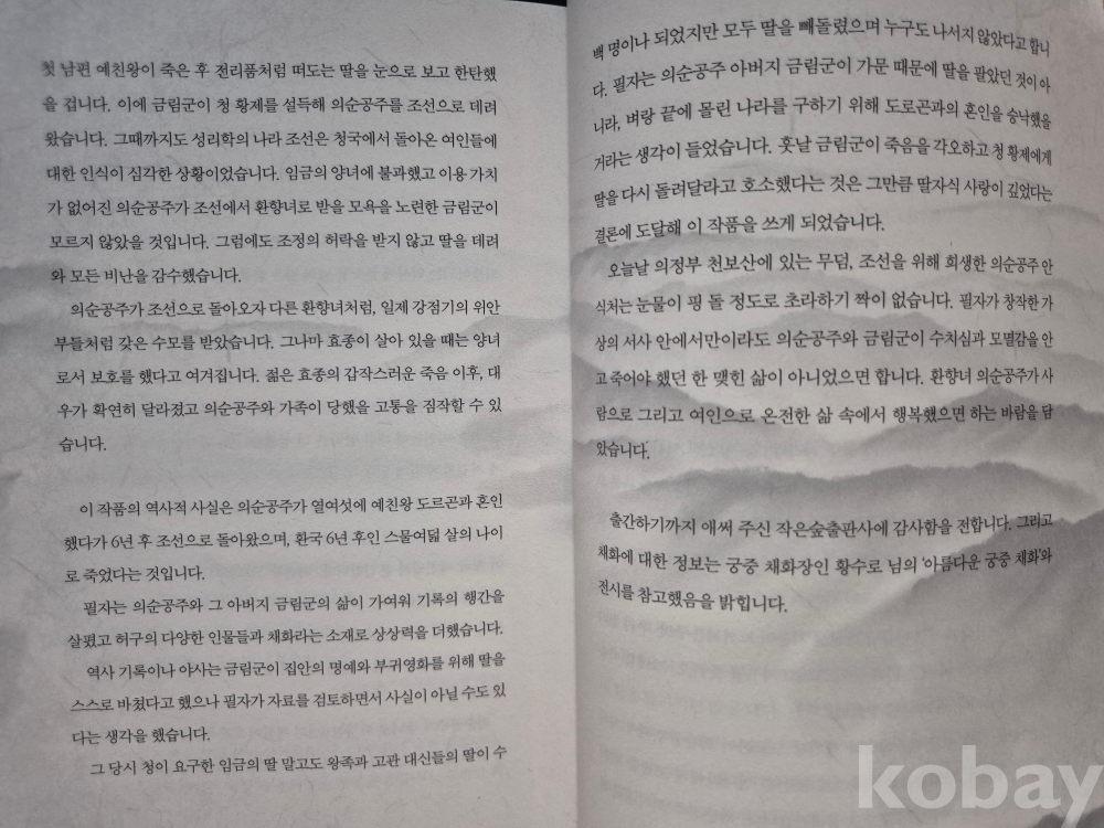 병자호란이 끝나고, 나라를 위해 스스로 공녀(貢女)가 되어 청나라로 떠난 의순공주(義順公主) 이야기.