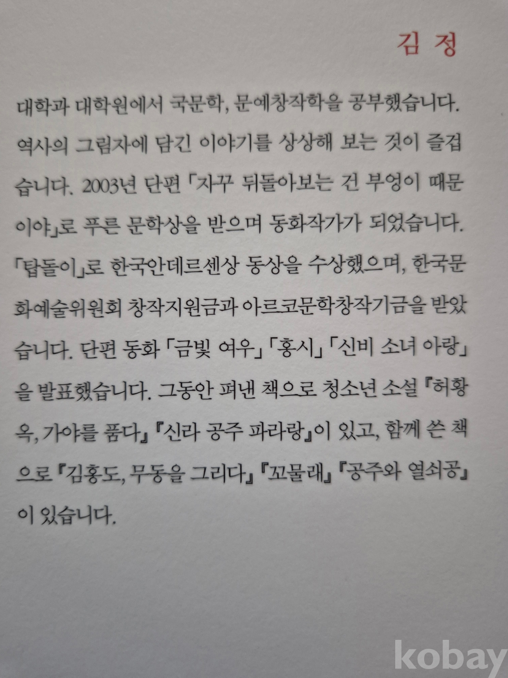 청소년 역사소설 『허황옥, 가야를 품다』(2010) 『신라 공주 파라랑』(2016) 『하얀 송골매』(2025) 등.