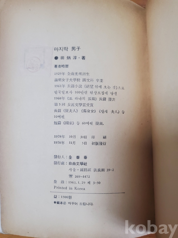 1. 마지막 남자, 전병순, 자유문학사, 1978년, 372쪽, 상태 상, 사진 참조