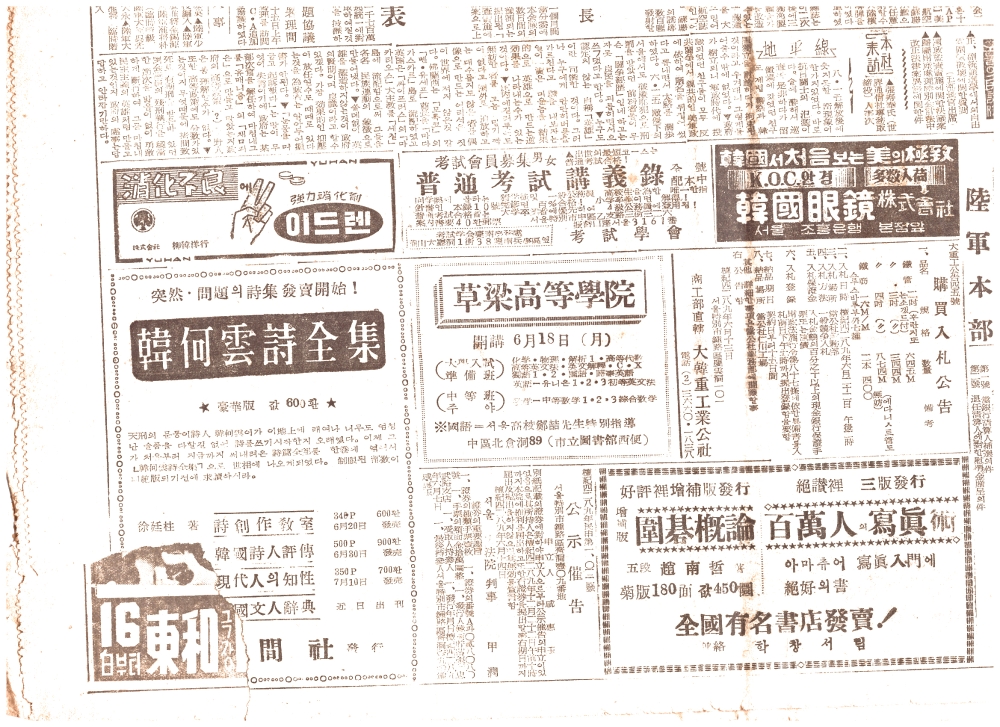 1면 하단 부분의 광고 (한하운 시전집 광고) 부분에서