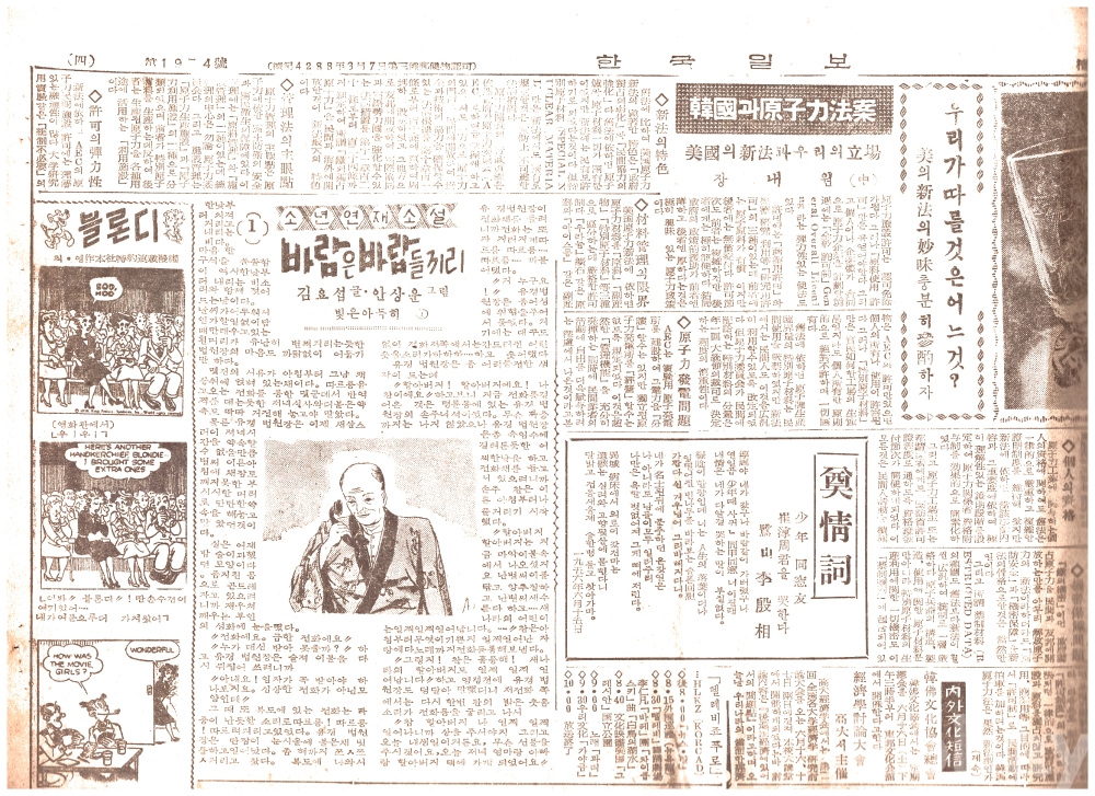 4면: 블론디 만화 (칙.영 작- 본사특약) / 소년 연재소설 바람은 바람들끼리 ( 김요섭 글),
