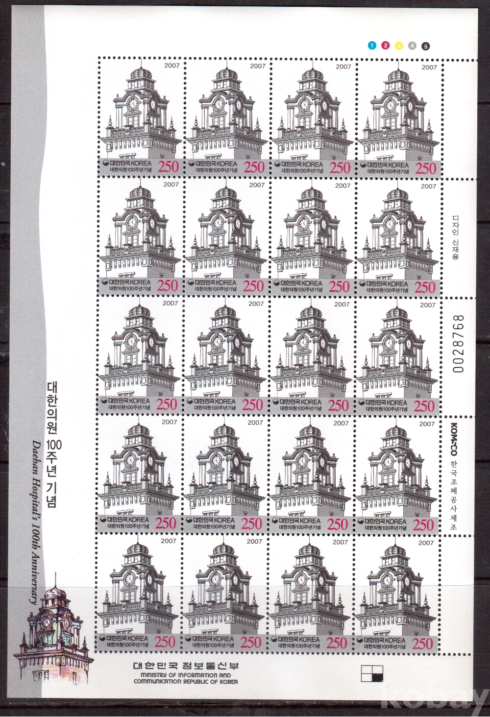 (한국전지) 2007.3.15 대한의원 100주년 sheet of 20 MNH