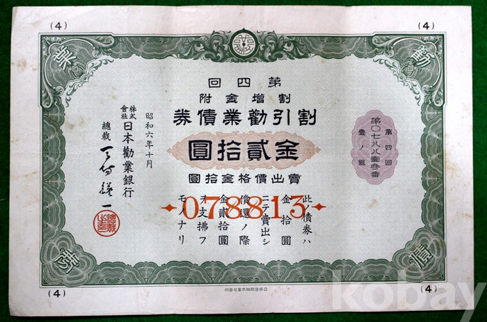 1931년 일본근업은행의 제4회 할증금부 할인근업채권 : 金 20원