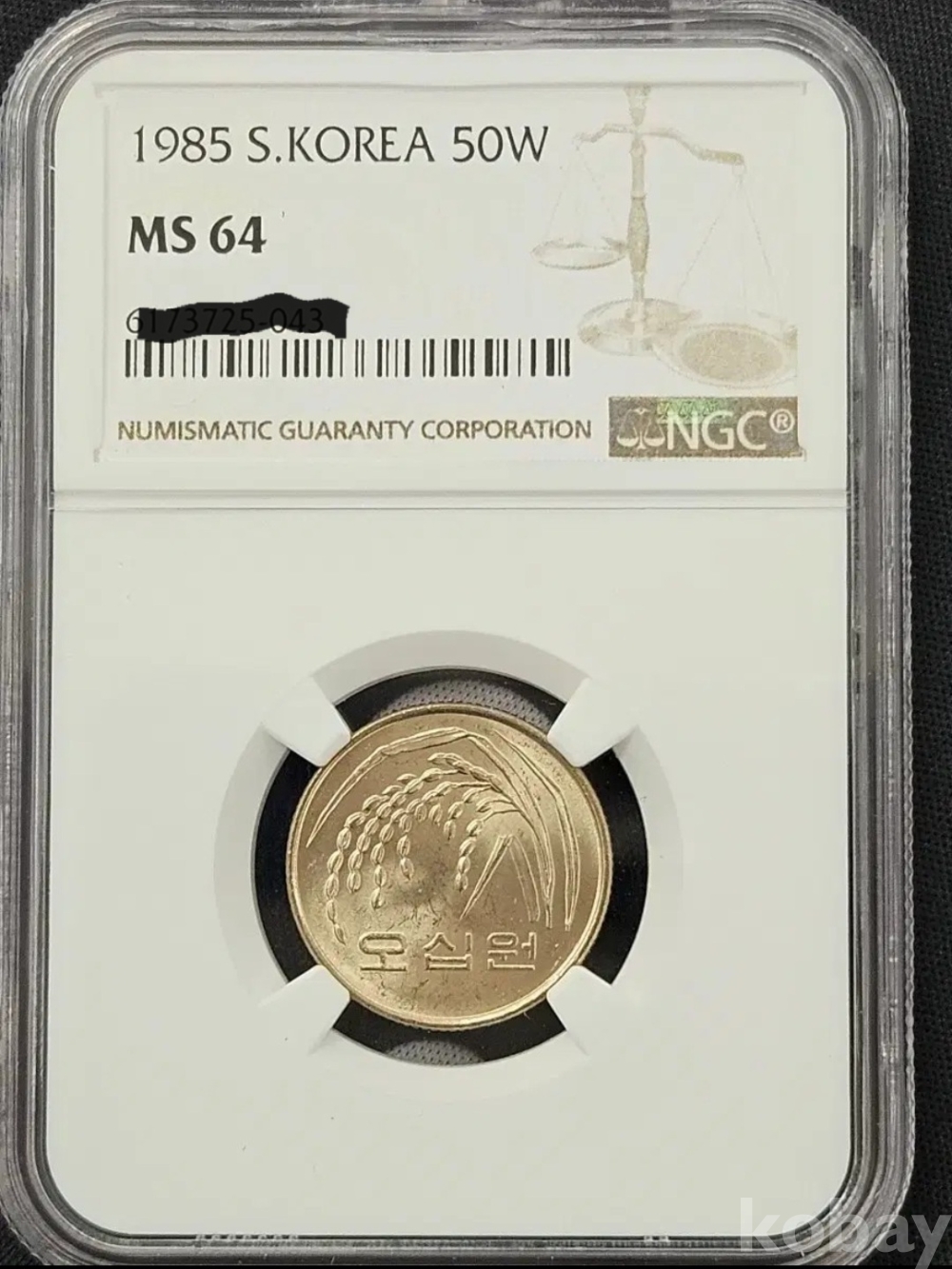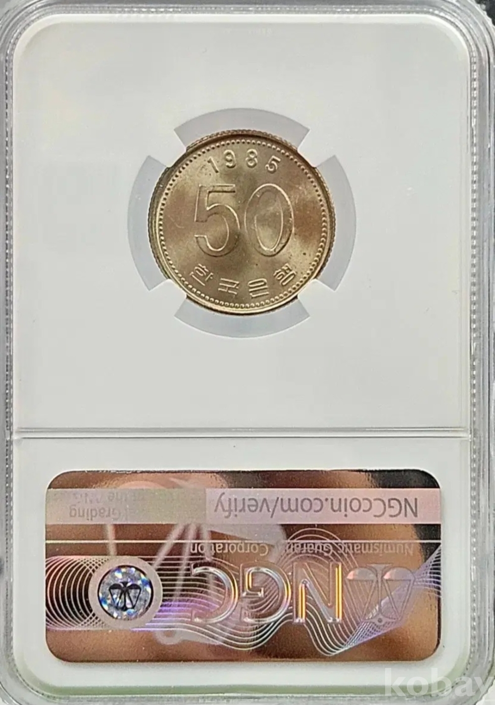 1985년도에 발행된 한국 50원 동전입니다. NGC사에서 MS64 등급을 받은 수집 가치가 높은 상품입니다. 사진에서 보시는 것과 같이 상태 좋습니다.