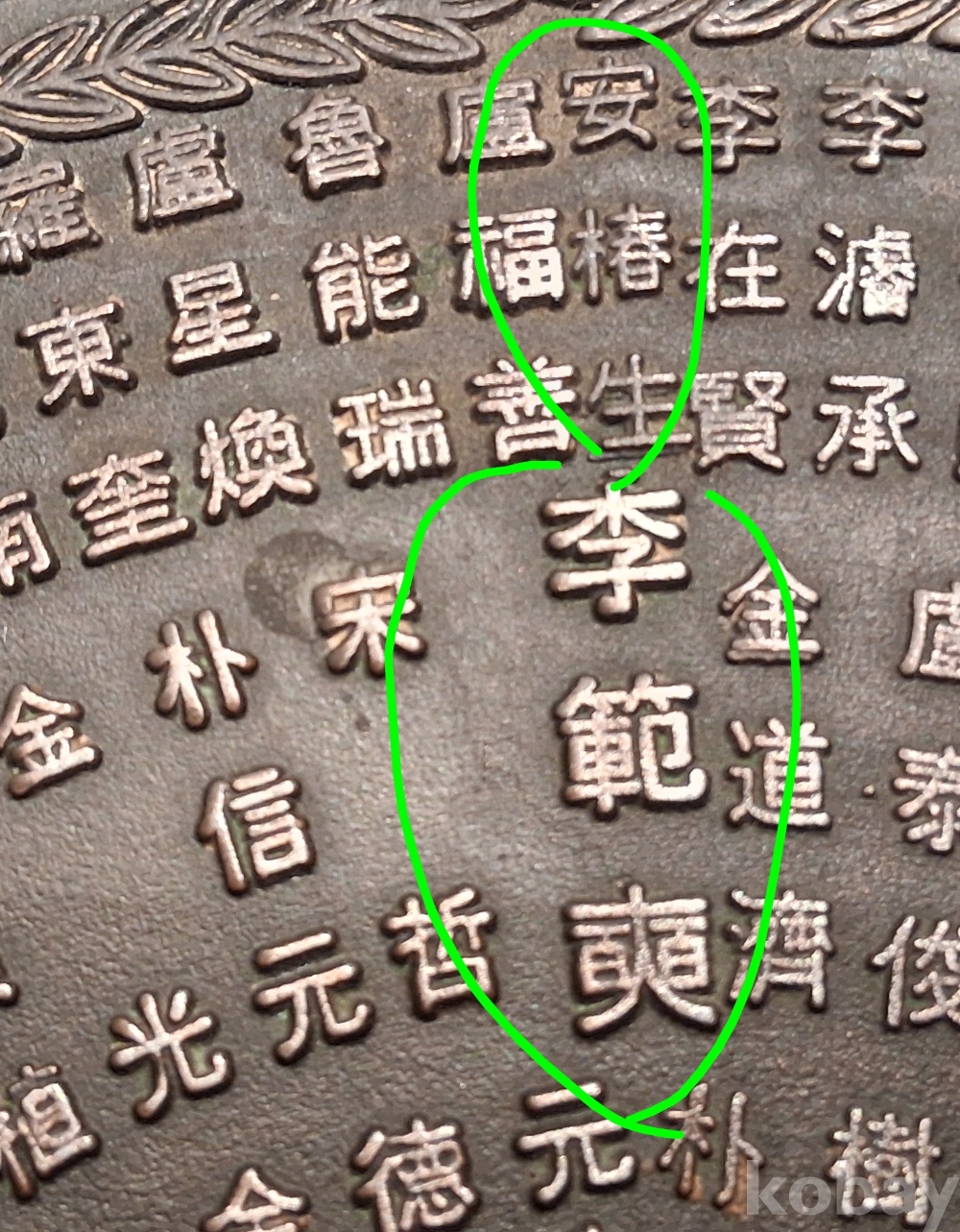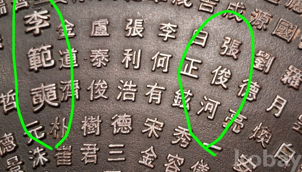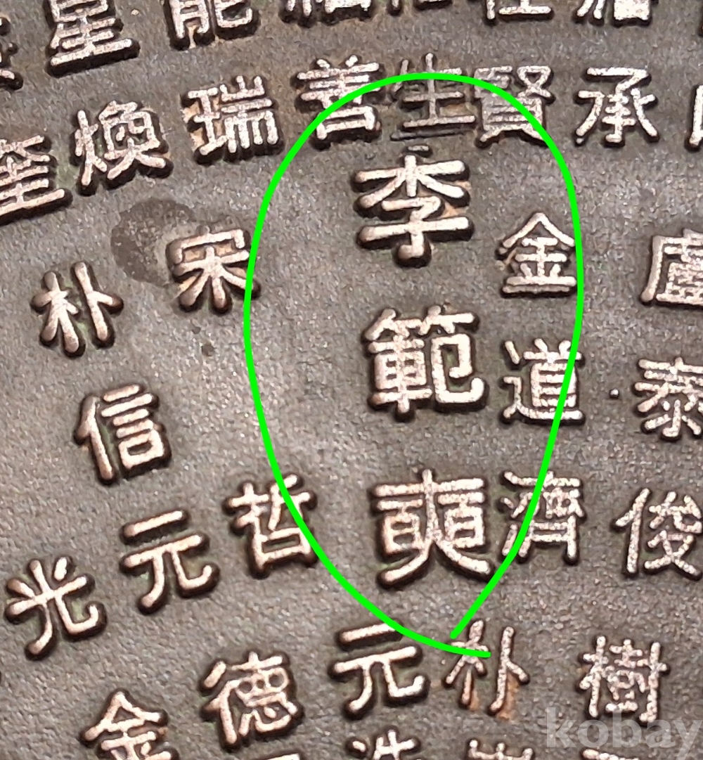 이범석, 장준하, 안춘생, 김준엽等이 새겨진 부분은 이미지에 초록색으로 마킹 표시