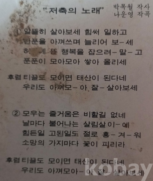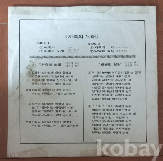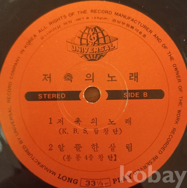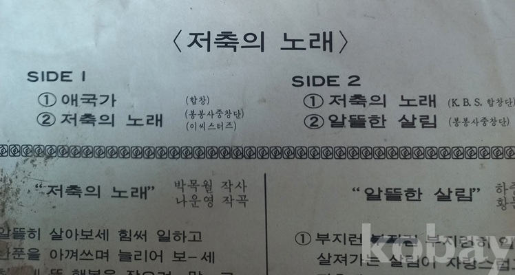 까마득한 예전 저축을 장려하던 시절이 있었지요. 당시에 저축추진중앙위원회에서 홍보용으로 제작되었던 판인것 같읍니다. 쟈켓 사진에 있는 저축추진중앙위원회 메달(세살부터 저축하고 여든까지 가난없다" 이 참 재미있읍니다. 요새도 있는지 모르겠읍니다만 언듯 "재형저축"이라는것도 생각나고. 저축노래는 물론 "저축의 날" 도 있었지 싶고. 상태는 쟈켓은 사진으로 보시겠지만 큰 흠 없으나 디스크는 뜨거운데 덴곳(붉은 선안)이 있읍니다 청음에는 문제가 있어 자료용으로 권합니다. 착오없으시길 바랍니다