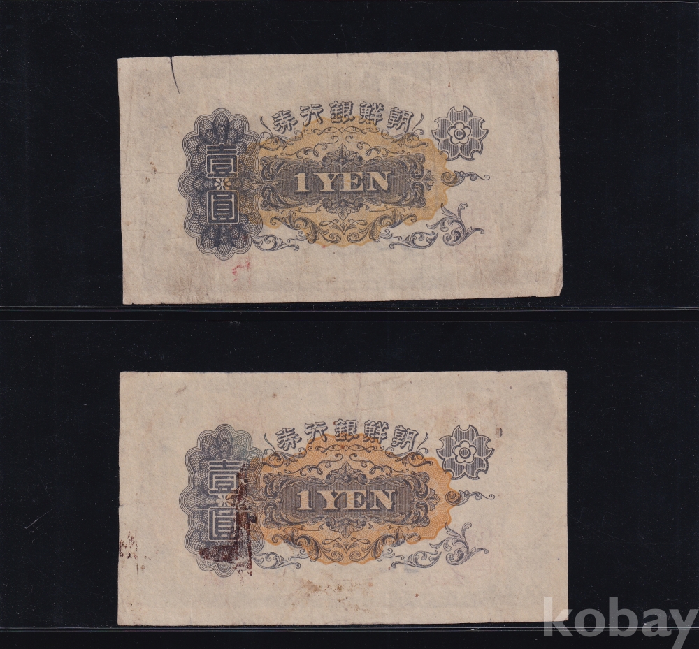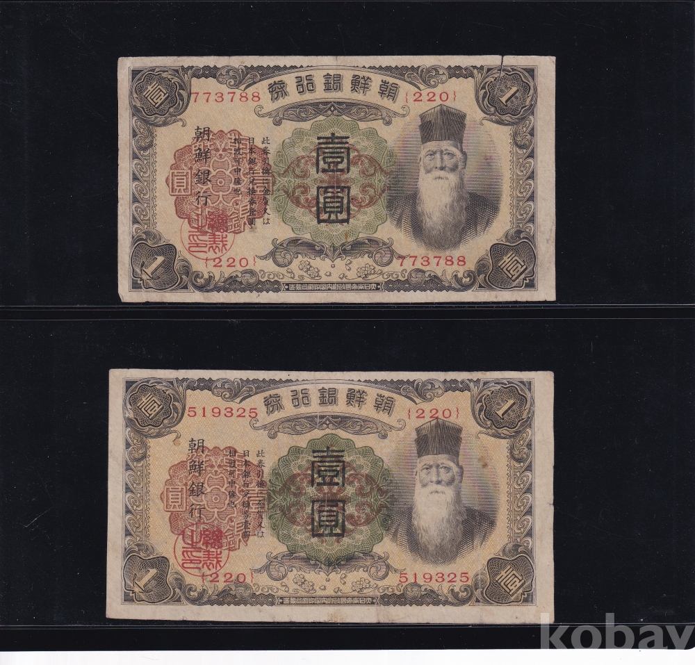 - 조선은행 1932년 개 일원 판번호 220번 유번호권 사용제 지폐 - 2장 일괄