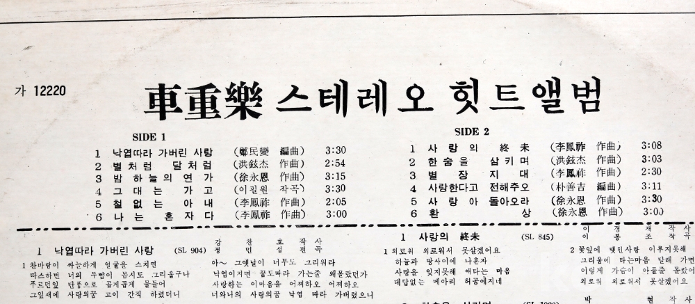 | 자켓상태 | EX : 약간의 마모, 모서리 찢김 존재 | 음반상태 | EX : 재생에 영향 없는 가벼운 기스 존재 | 발매정보 | 알수없음 | 가사지여부 | 무 |