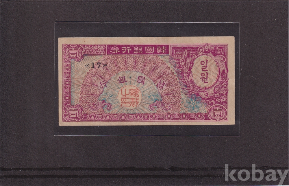 - 한국은행 1953년 거북선 미제 일환(원) 판번호 17번 극미 사용제 지폐