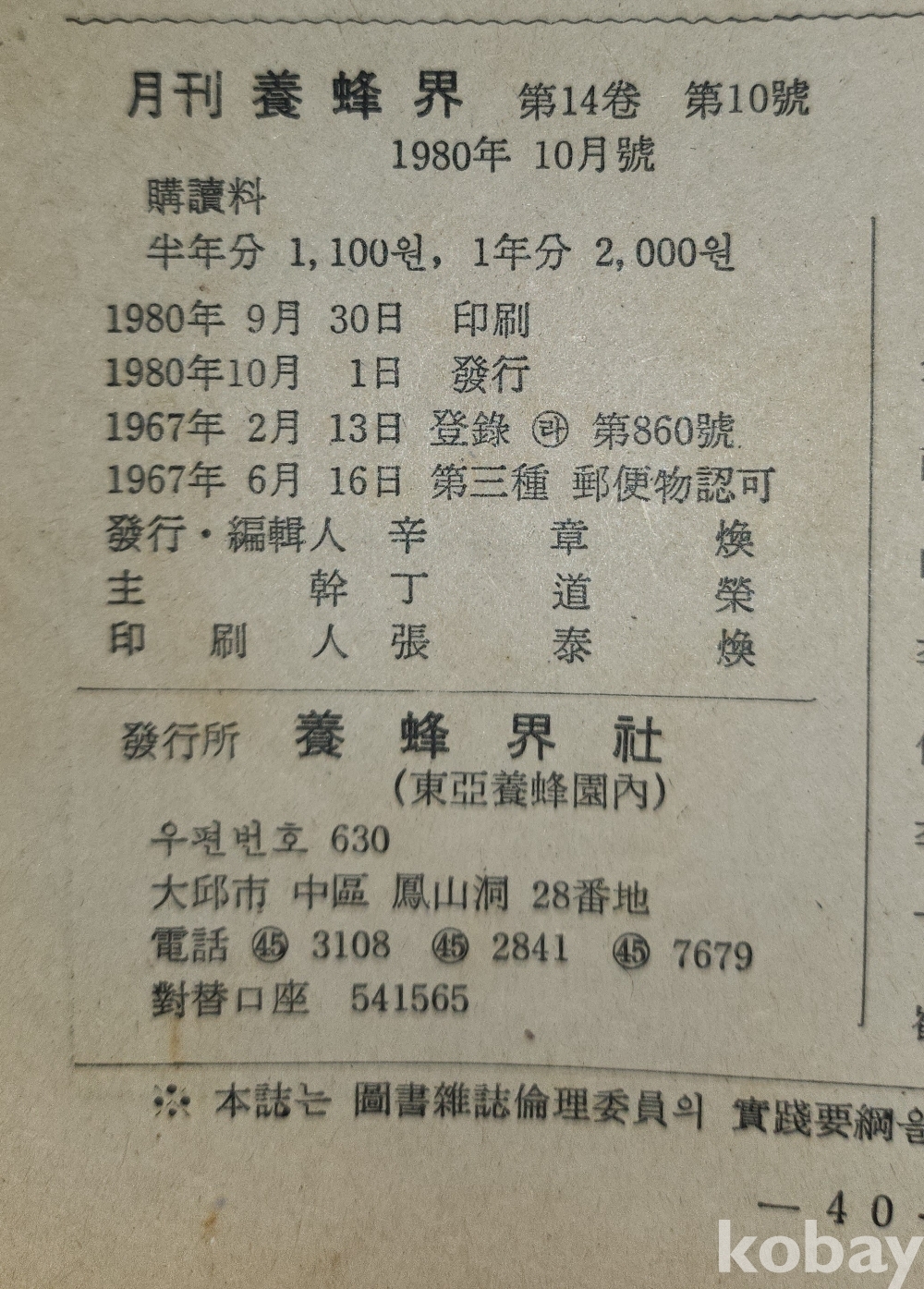 1980 년에 발행된 양봉계(養蜂界) 양봉계사 발행 10 월호입니다,