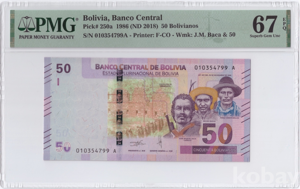액면 : 50 볼리비아노 발행 : 2018년 상태 : PMG 67 EPQ 비고 : P-250a