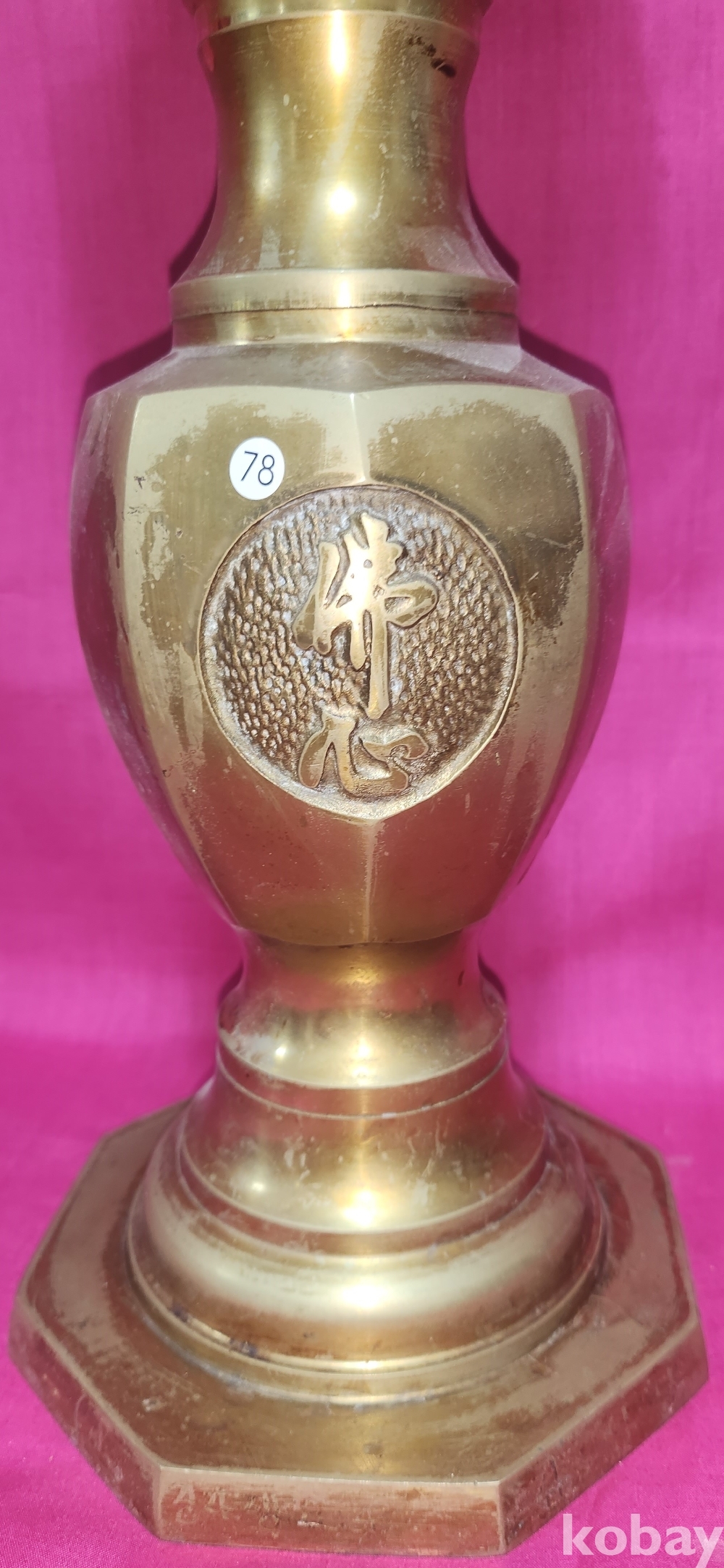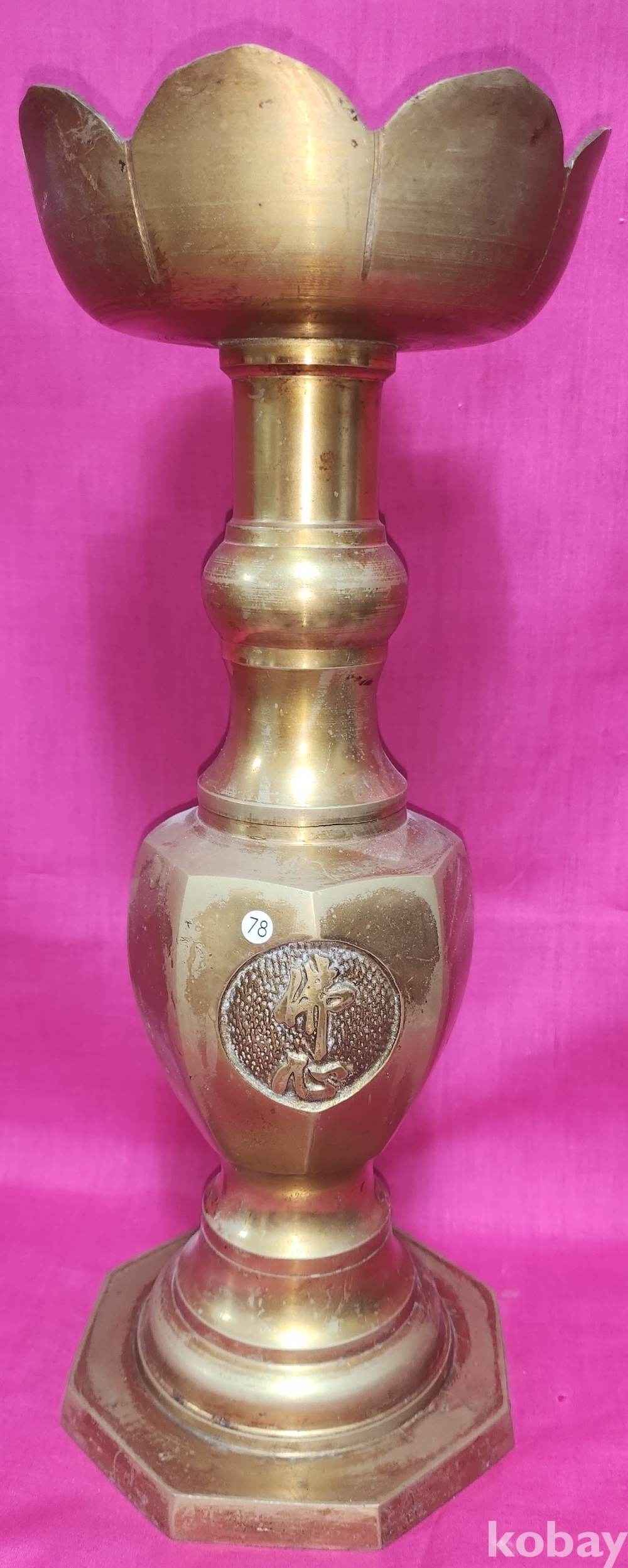 황동으로 만든 불심(佛心) 문자와 옴마니반메훔(唵麽抳鉢銘吽) 뜻 문양 화형 8각 촛대입니다,