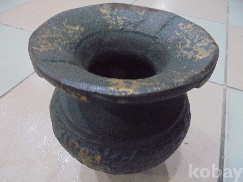 화병처럼 입이 넗으며 ㅇ알수없는 괴음양각무늬와 두터운 무쇠로 무거워 안정되며 보기드문 입이넗은 무거운 무쇠 무늬화병류