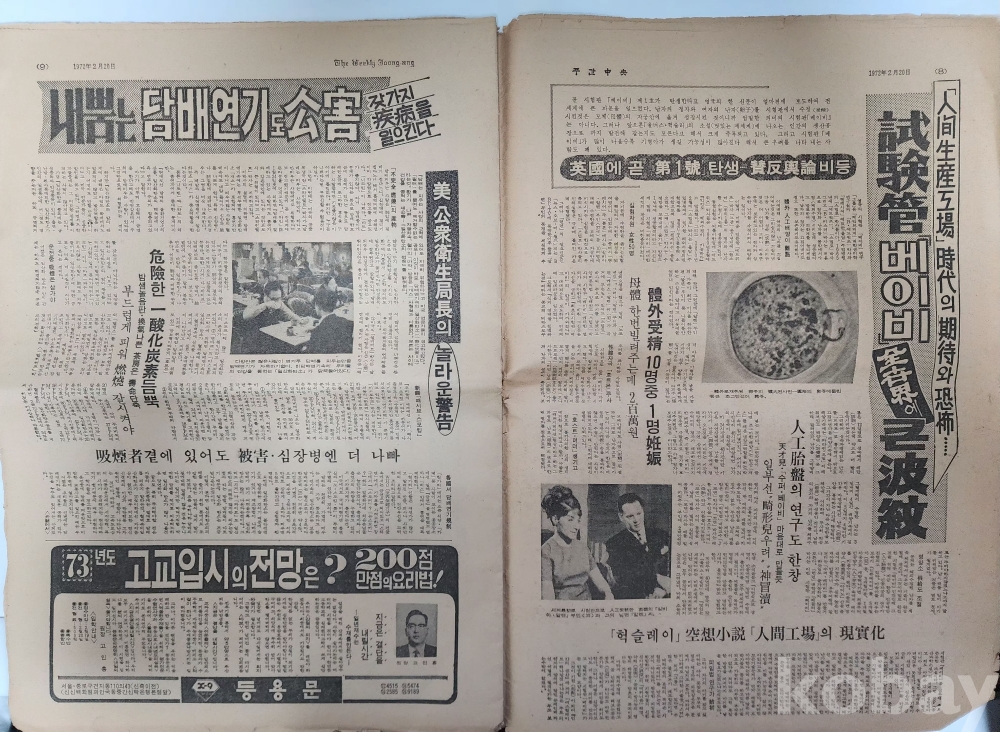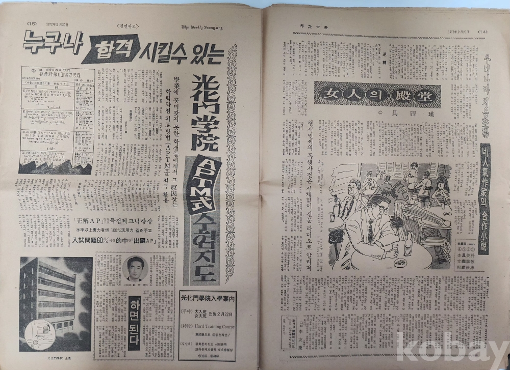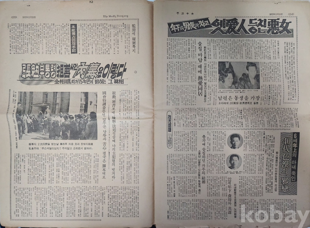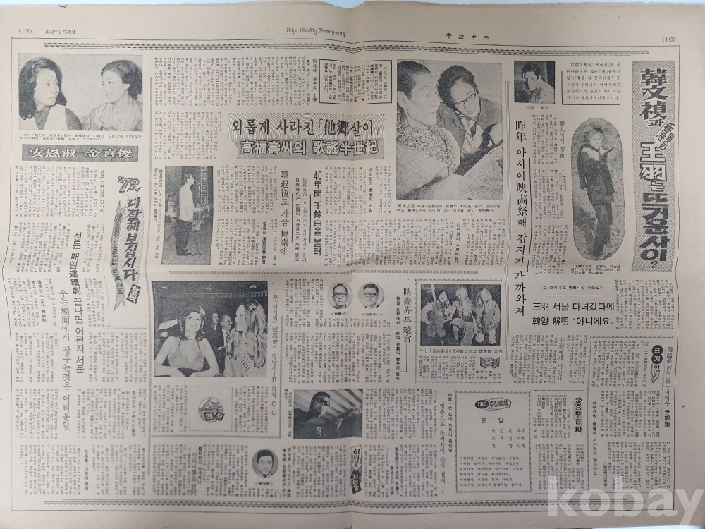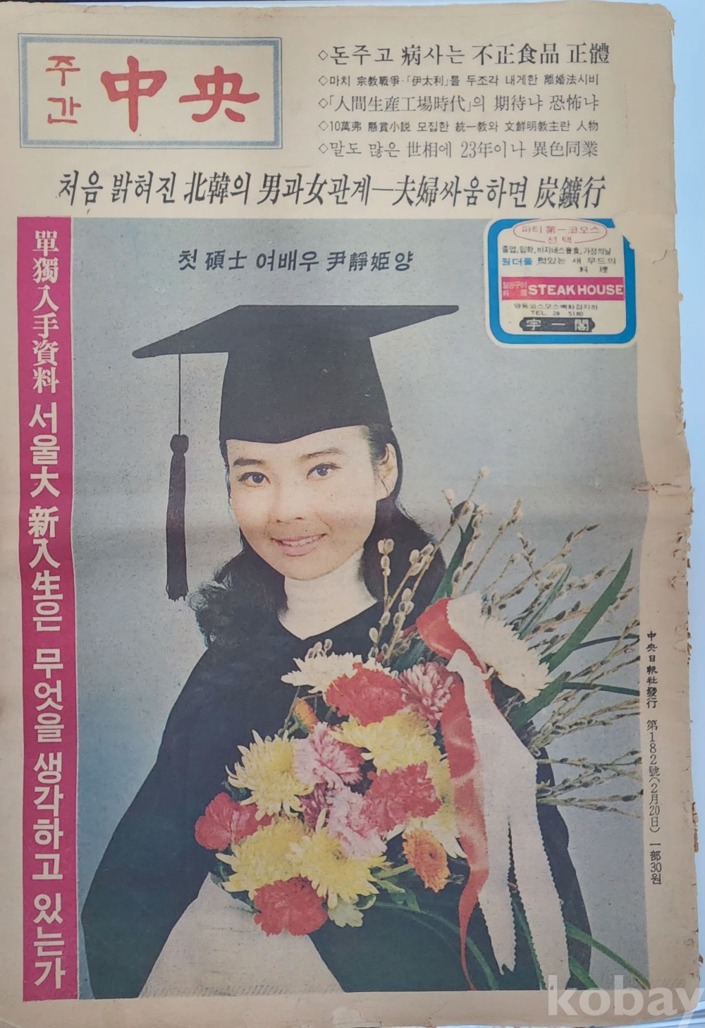 참고 사항 | 1면. ‘첫 碩士 여배우 윤정희(尹靜姬, 1944~2023)양’ 표지모델. 2면. 일제 강점기 경기도 양주 출신의 정치가이자 독립운동가 조시원(趙時元, 1904~1982)이 광복회 회장직을 맡아 활동 중인 소식 기사. 4~5면. 본지 단독 입수 서울대 신입생 무엇을 어떻게 생각하고 있나. 6면. ‘키신저’는 조용히 사라질 것인가. 은퇴설 나도는 미국 비밀 외교의 명수 그 배경. 7면. 돈 뺏고 병 주는 부정식품. ▪제일복장 댄디 신사기성복 광고. 8면. ‘인간생산공장’ 시대의 기대와 공포. 시험관 베이비 전세계에 큰 파문. 9면. 73년도 고교입시의 전망은? 등용문 입시학원 광고. 10~11면. 이혼은 절대 불가. 부부싸움은 탄광행. 전향 남파 간첩들이 털어놓는 북한의 남과 여의 관계. ▪제일모직 부루진 광고. 12면. ▪에스콰이아 제화 주식회사 광고 13면. ▪중구 다동 맥주홀 엠파이어 광고. 14면. 우리나라 처음 등장 네 인기작가의 합작소설 박경수, 강용준, 구혜영, 이문희 15면. ▪누구나 합격시킬 수 있는 광화문학원 APTM식 수험지도 전면광고. 16~17면. 외롭게 사라진 「타향살이」 고복수(高福壽, 1911~1972.2.10.) 가요반세기, 한국 최초 석사 여배우 윤정희, 신성일(申星一, 1937~2018) 자택 강도 사건, 남진(金南鎭, 1945~) 영화 주연 소식, 가요베스트10, TBC 추천 가요 등. 18면. ‘이탈리아’를 두 조각 낸 이혼법 시비. 19면. ▪동아제약 베스타제 광고 20면. 허근욱 연재작 「荒地의 빛」 ㉗, 삽화 김세종. ▫허근욱(許槿旭, 1930~2017)은 대한민국의 작가, 소설가, 문인, 방송인이다. 또한 북한 최고인민회의 초대의장 딸인 허 작가는 일제강점기 민족변호사이자 남노당 당수를 지냈던 허헌(許憲, 1885~1951)의 둘째 딸로, 남편과 함께 월남한 이후 간첩죄로 구속되는 등 굴곡 어린 삶을 살았다. ▫김세종(金世種): 서울대문리대 졸업, 그림 그리는 것을 좋아해 독학으로 미술 공부를 해온 그는 그간 50여 편의 신문소설 삽화를 그려오며 삽화가로서 지위를 굳혔다. 23면. 대한민국의 프로 바둑 기사 서봉수(徐奉洙, 1953년~)의 기사 ‘무서운 신인 나왔다’. 25면. 본지 독점 연재 수기 「장면(張勉, 1899~1966) 부통령 저해 사건 내막은 이렇다. ⑦」_김상붕(金相鵬)씨가 15년 만에 밝히는 그 진상. 26면. 이색동업 28년 한 설렁탕집의 두 여주인 ‘옥천옥(沃川屋)’. 27면. ▪‘송 오브 노르웨이’ 대한극장 광고. 28면. 사체를 구합니다. 끔찍한 이색 교실. 29면. 자칭 새시대의 예언자. 통일교주 문선명(文鮮明, 1920~2012)이란 사나이. 6천3백 달러를 들여 뉴욕타임즈에 낸 전면광고 사진 게재. ▪구정 특별 프로 ‘분노의 세얼굴’ 세기극장 광고. 30면. 한 장의 이사진 영화배우 김진규(金振奎, 1923~1998) ‘65년 홍콩에서 『多情佛心』 찍으러 갔다 스티브 매퀸 夫妻와’ 31면. 길창덕(吉昌悳, 1930~2010) ‘미스터 小院君’ 만화. |