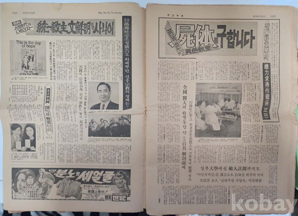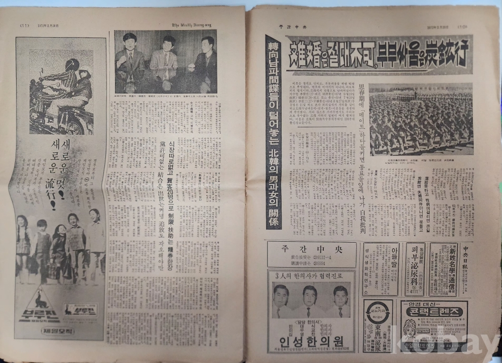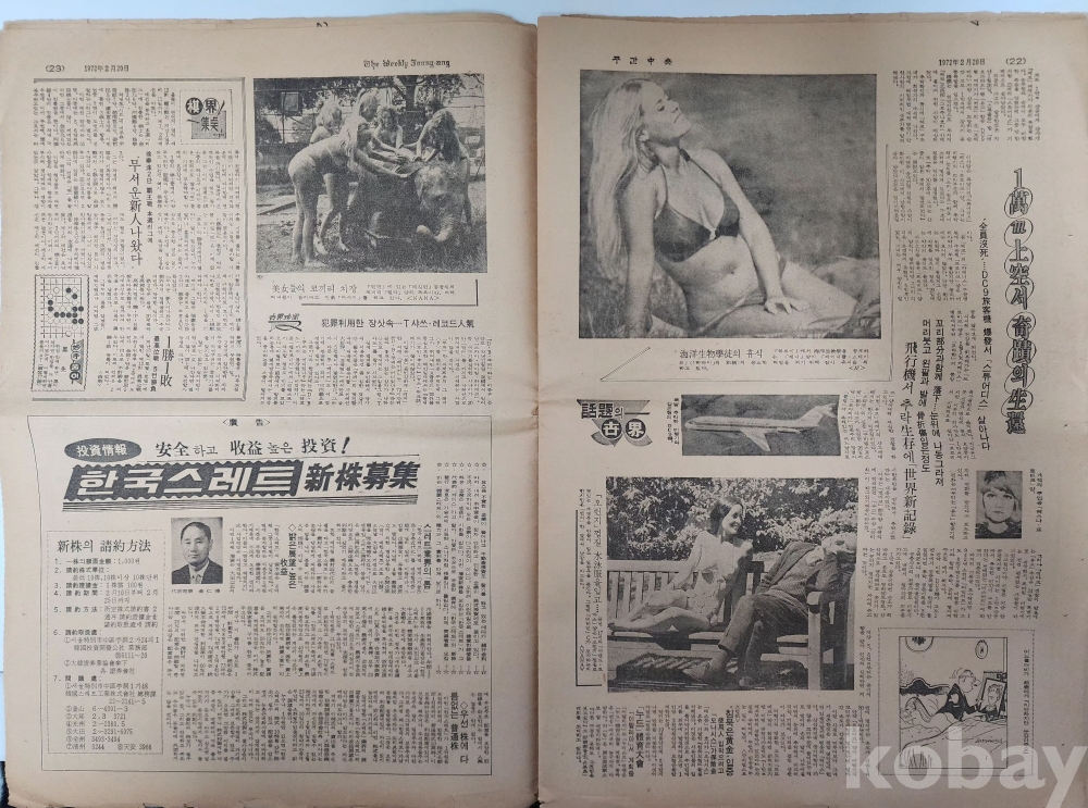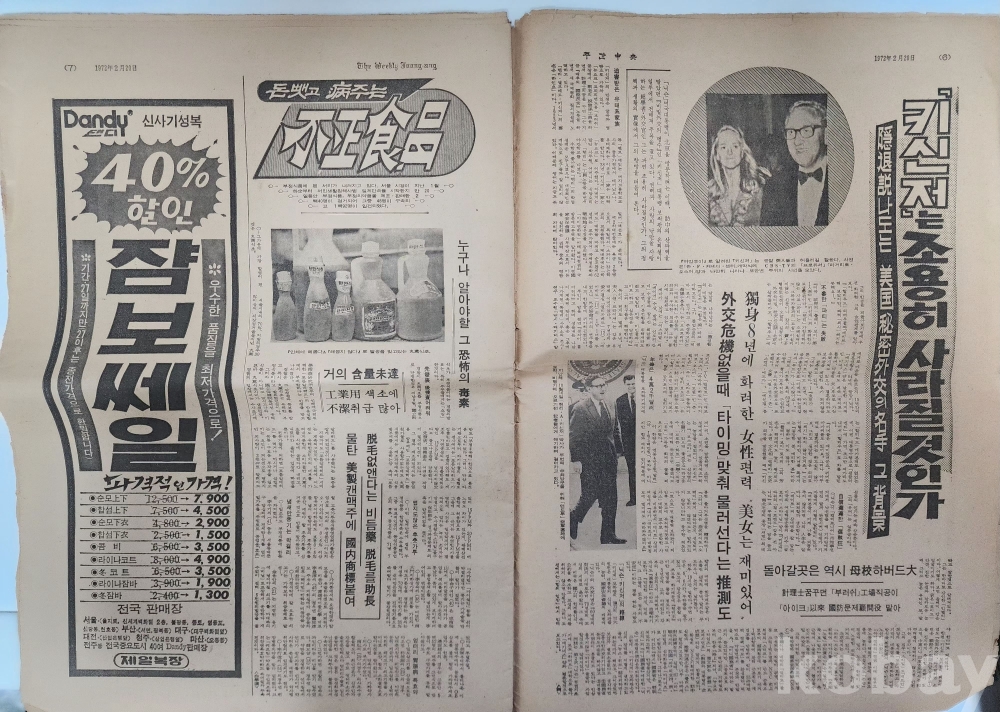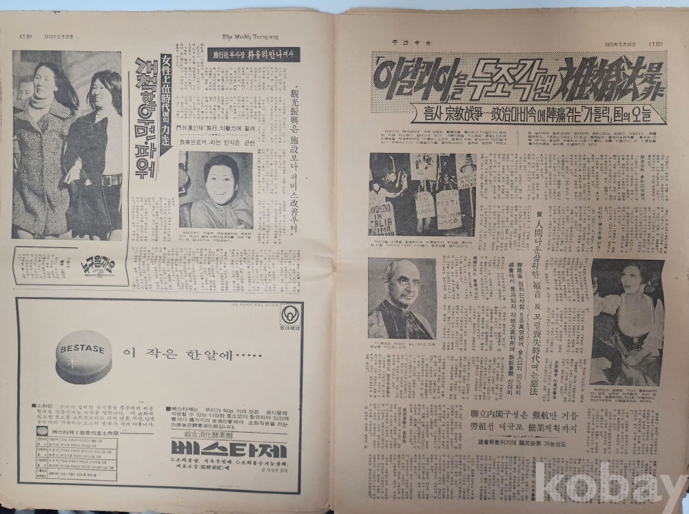 참고 사항 | 1면. ‘첫 碩士 여배우 윤정희(尹靜姬, 1944~2023)양’ 표지모델. 2면. 일제 강점기 경기도 양주 출신의 정치가이자 독립운동가 조시원(趙時元, 1904~1982)이 광복회 회장직을 맡아 활동 중인 소식 기사. 4~5면. 본지 단독 입수 서울대 신입생 무엇을 어떻게 생각하고 있나. 6면. ‘키신저’는 조용히 사라질 것인가. 은퇴설 나도는 미국 비밀 외교의 명수 그 배경. 7면. 돈 뺏고 병 주는 부정식품. ▪제일복장 댄디 신사기성복 광고. 8면. ‘인간생산공장’ 시대의 기대와 공포. 시험관 베이비 전세계에 큰 파문. 9면. 73년도 고교입시의 전망은? 등용문 입시학원 광고. 10~11면. 이혼은 절대 불가. 부부싸움은 탄광행. 전향 남파 간첩들이 털어놓는 북한의 남과 여의 관계. ▪제일모직 부루진 광고. 12면. ▪에스콰이아 제화 주식회사 광고 13면. ▪중구 다동 맥주홀 엠파이어 광고. 14면. 우리나라 처음 등장 네 인기작가의 합작소설 박경수, 강용준, 구혜영, 이문희 15면. ▪누구나 합격시킬 수 있는 광화문학원 APTM식 수험지도 전면광고. 16~17면. 외롭게 사라진 「타향살이」 고복수(高福壽, 1911~1972.2.10.) 가요반세기, 한국 최초 석사 여배우 윤정희, 신성일(申星一, 1937~2018) 자택 강도 사건, 남진(金南鎭, 1945~) 영화 주연 소식, 가요베스트10, TBC 추천 가요 등. 18면. ‘이탈리아’를 두 조각 낸 이혼법 시비. 19면. ▪동아제약 베스타제 광고 20면. 허근욱 연재작 「荒地의 빛」 ㉗, 삽화 김세종. ▫허근욱(許槿旭, 1930~2017)은 대한민국의 작가, 소설가, 문인, 방송인이다. 또한 북한 최고인민회의 초대의장 딸인 허 작가는 일제강점기 민족변호사이자 남노당 당수를 지냈던 허헌(許憲, 1885~1951)의 둘째 딸로, 남편과 함께 월남한 이후 간첩죄로 구속되는 등 굴곡 어린 삶을 살았다. ▫김세종(金世種): 서울대문리대 졸업, 그림 그리는 것을 좋아해 독학으로 미술 공부를 해온 그는 그간 50여 편의 신문소설 삽화를 그려오며 삽화가로서 지위를 굳혔다. 23면. 대한민국의 프로 바둑 기사 서봉수(徐奉洙, 1953년~)의 기사 ‘무서운 신인 나왔다’. 25면. 본지 독점 연재 수기 「장면(張勉, 1899~1966) 부통령 저해 사건 내막은 이렇다. ⑦」_김상붕(金相鵬)씨가 15년 만에 밝히는 그 진상. 26면. 이색동업 28년 한 설렁탕집의 두 여주인 ‘옥천옥(沃川屋)’. 27면. ▪‘송 오브 노르웨이’ 대한극장 광고. 28면. 사체를 구합니다. 끔찍한 이색 교실. 29면. 자칭 새시대의 예언자. 통일교주 문선명(文鮮明, 1920~2012)이란 사나이. 6천3백 달러를 들여 뉴욕타임즈에 낸 전면광고 사진 게재. ▪구정 특별 프로 ‘분노의 세얼굴’ 세기극장 광고. 30면. 한 장의 이사진 영화배우 김진규(金振奎, 1923~1998) ‘65년 홍콩에서 『多情佛心』 찍으러 갔다 스티브 매퀸 夫妻와’ 31면. 길창덕(吉昌悳, 1930~2010) ‘미스터 小院君’ 만화. |