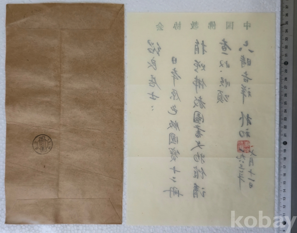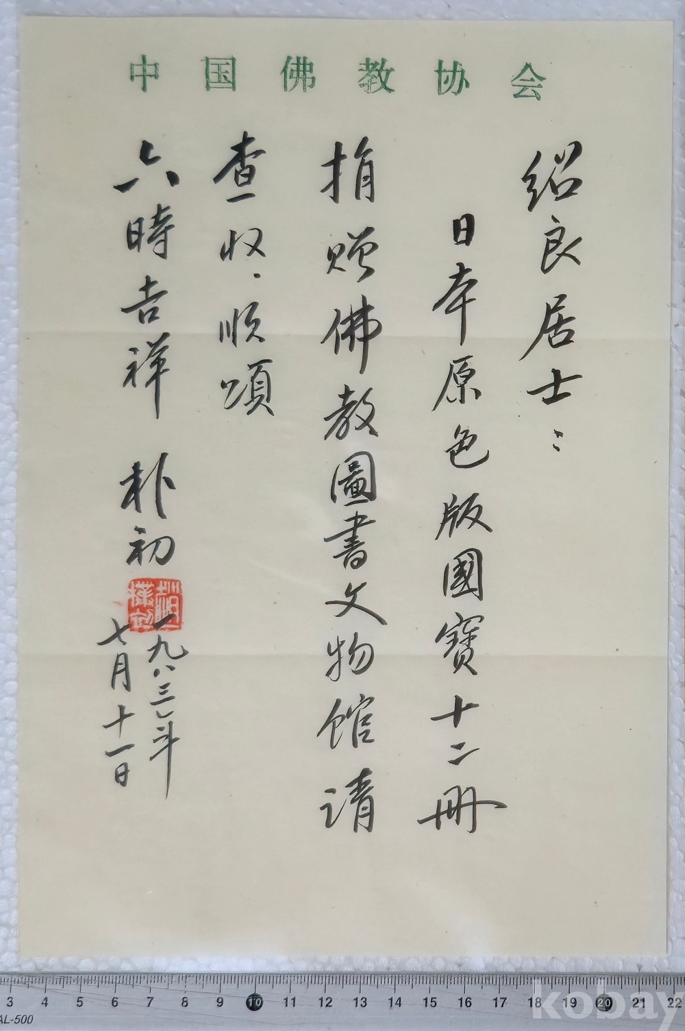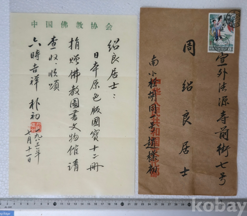 趙樸初(1907-2000,중국불교협회회장)선생 편지/周紹良(1917-2005,문물감정전가,북경시불교협회제4기명예회장,중국불교협회부회장겸비서장)선생에게,1983년,中國