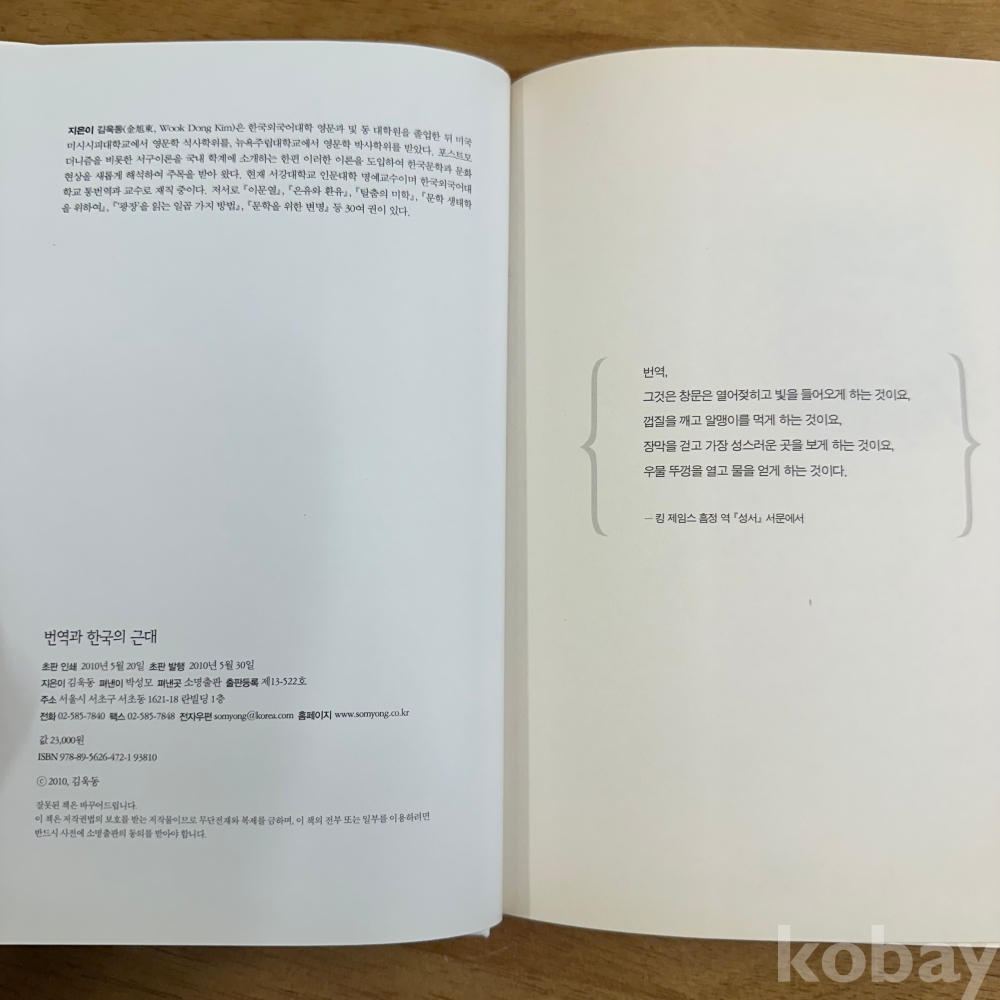 [한국근대사, 중역, 삼중번역] 김욱동, <번역과 한국의 근대>, 소명출판, 2010, p. 343, 상태 중급(사진참조)
