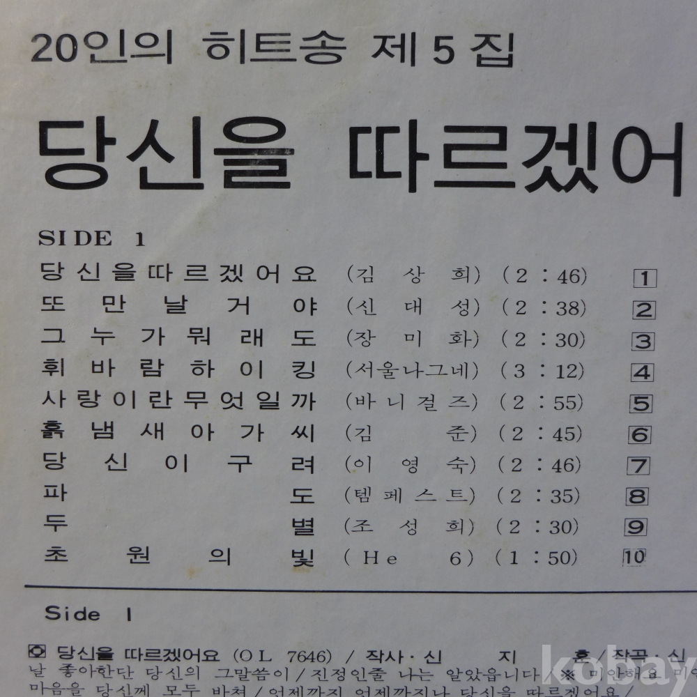 (귀한)LP음반: 20인의 히트송 제5집 : 템페스트의 "파도", 허림의"보내고 나서"등 수록앨범