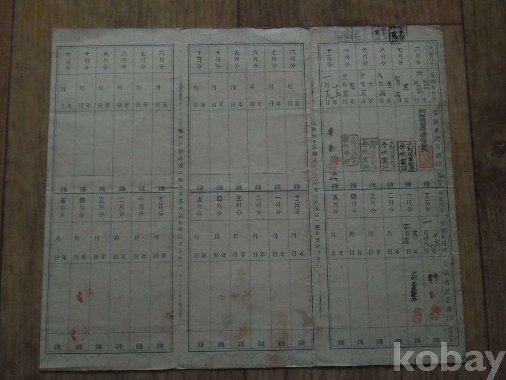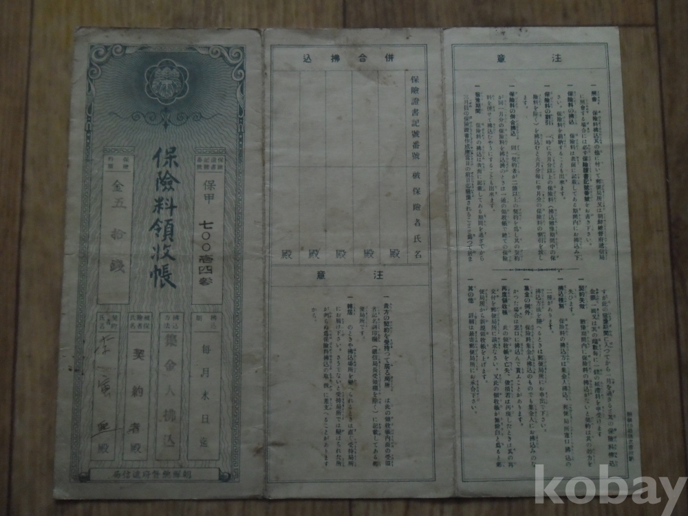 소화12년 조선총독부체신국 발행 보험료영수장