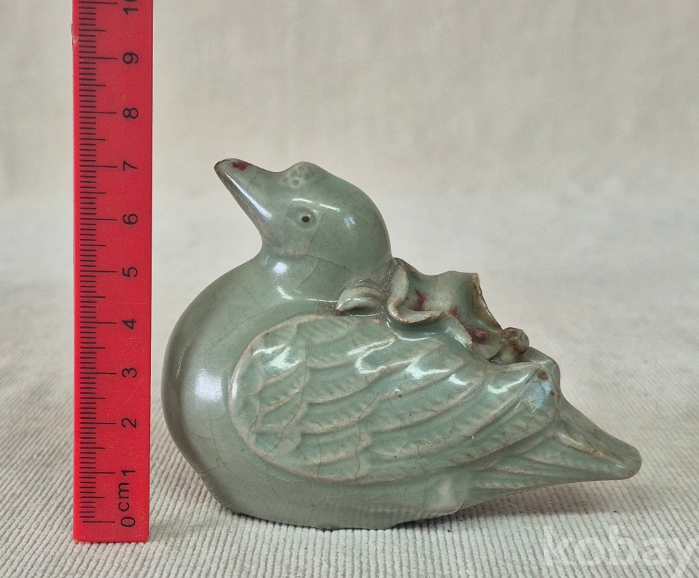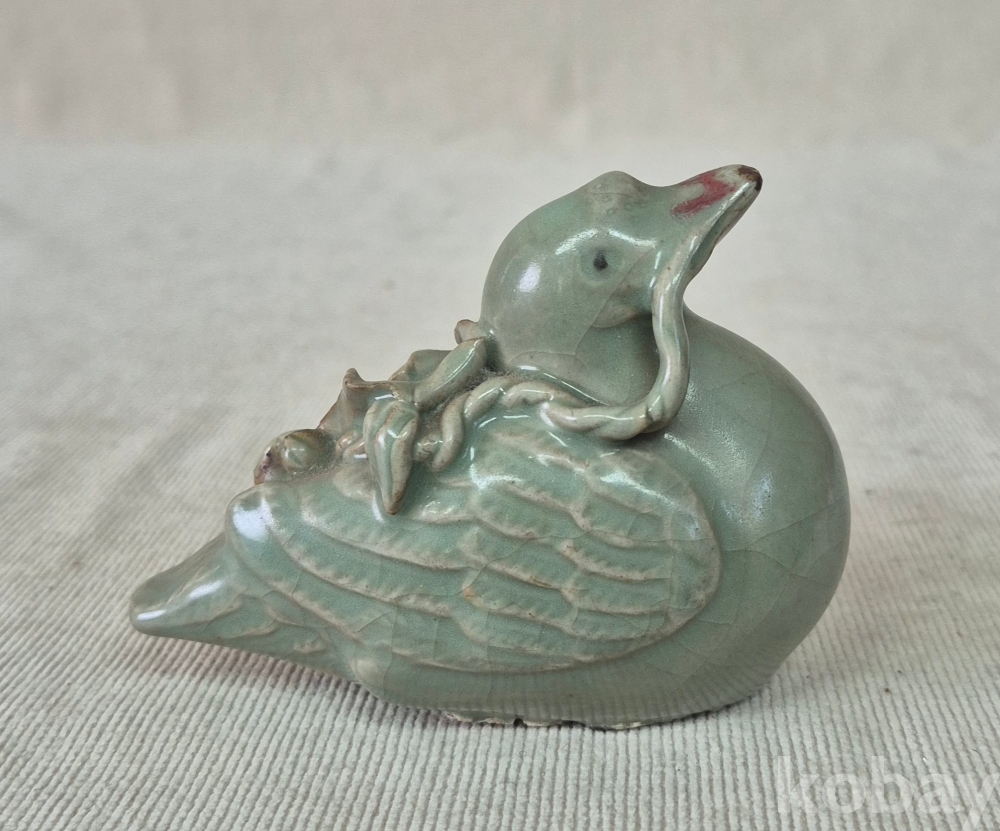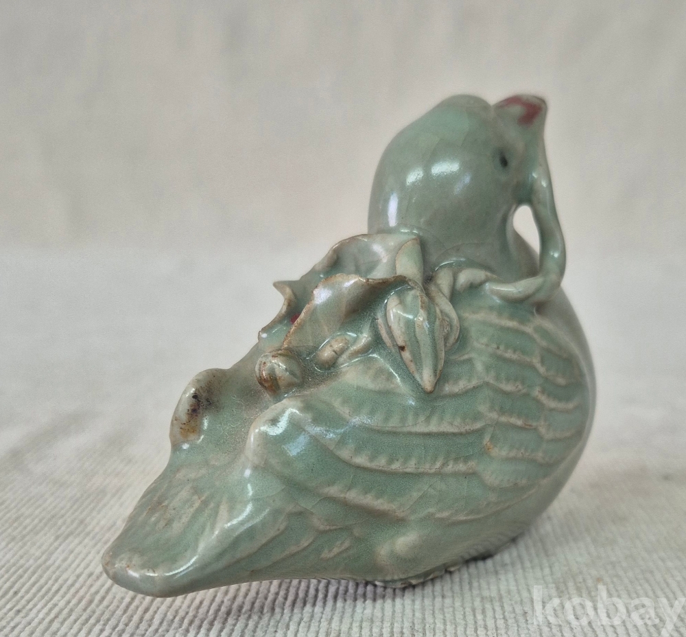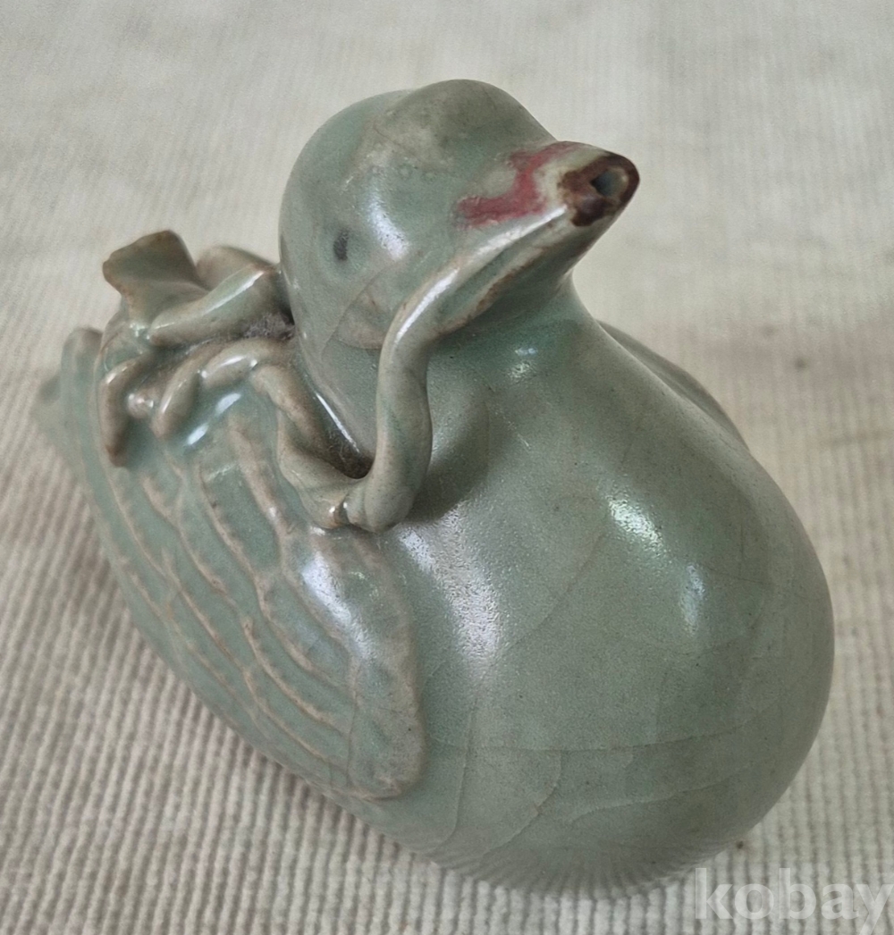 연잎과 연꽃잎을 물고진 오리형상을 표현한 청자 도자기 연적입니다. 유약에 빙열은있으며 유,수리없이 상태좋습니다. 크기와함께사진참고해주세요.