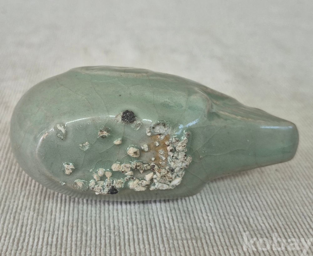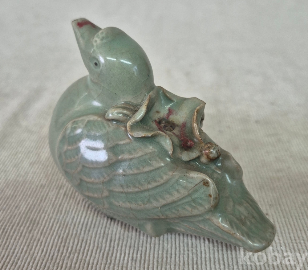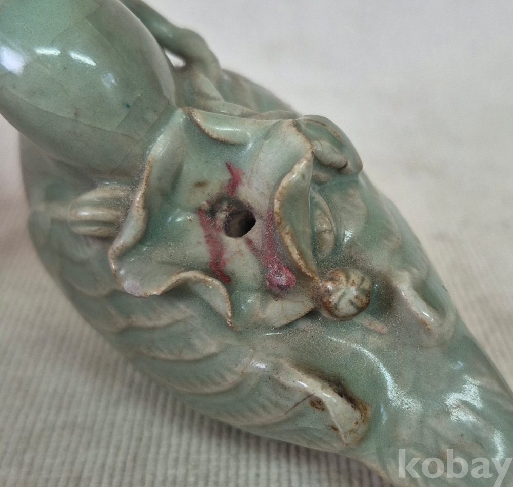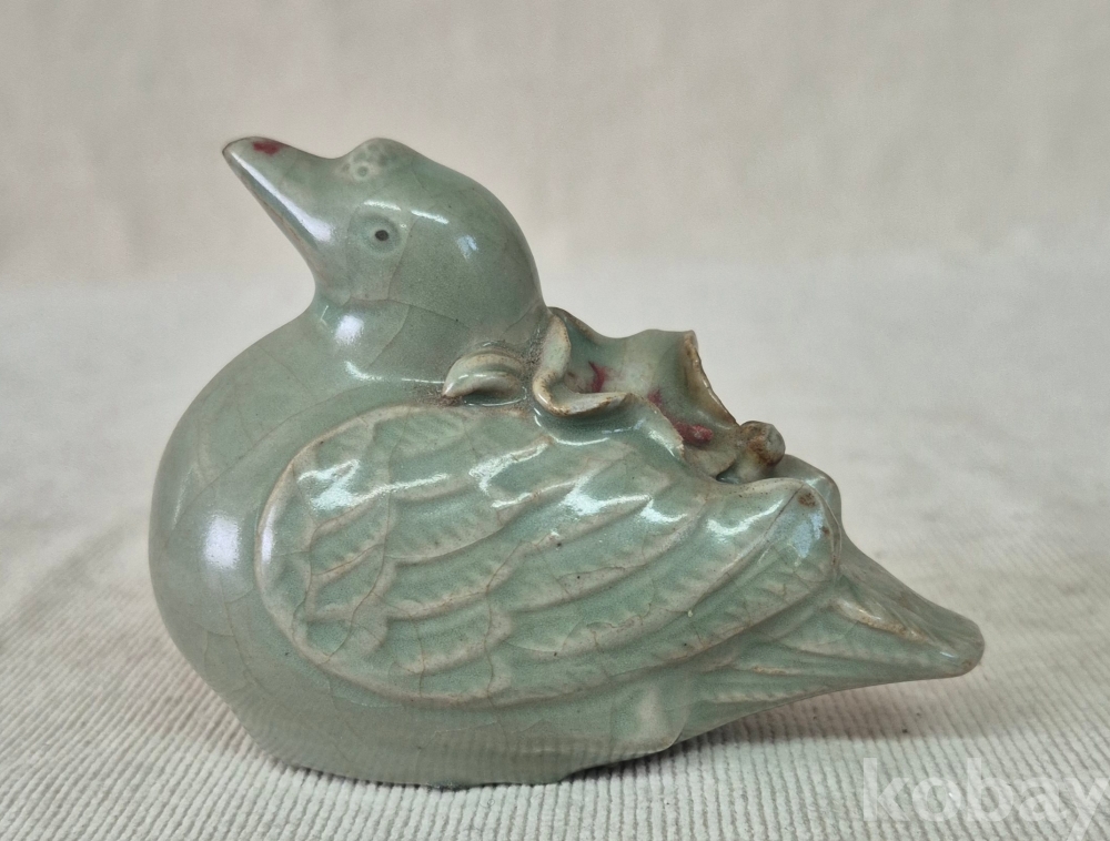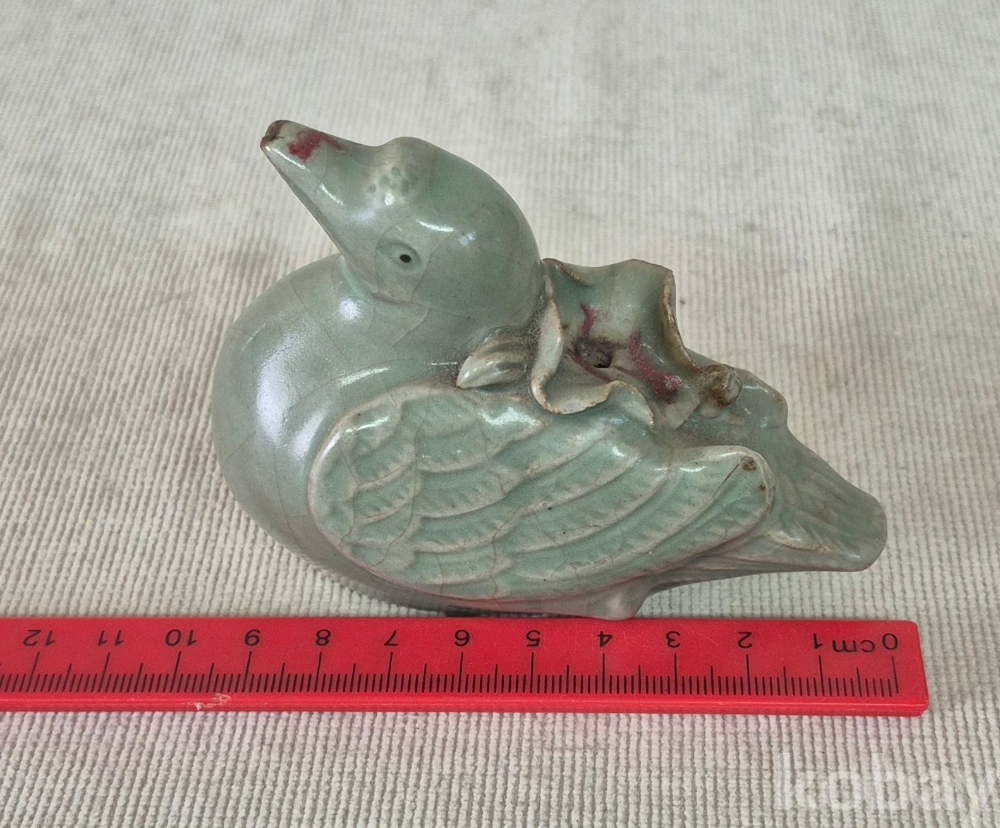 연잎과 연꽃잎을 물고진 오리형상을 표현한 청자 도자기 연적입니다. 유약에 빙열은있으며 유,수리없이 상태좋습니다. 크기와함께사진참고해주세요.