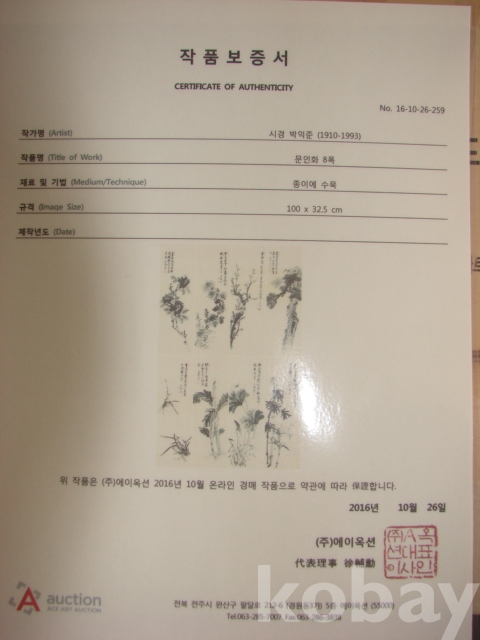 # 출처 4324 한국미술연감 669쪽(1991 한국미술연감사). A-옥션 작품보증서 있음. 8폭 중 1폭임. 미사용 작품으로 약한 얼룩 압정 자국 등 있음.