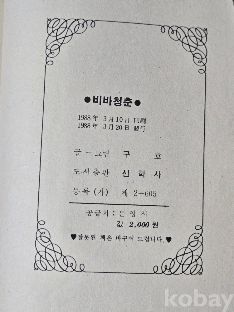 성인만화 == 비바청춘 1권.2권= 2책일괄 == 1988년 발행 == 구호