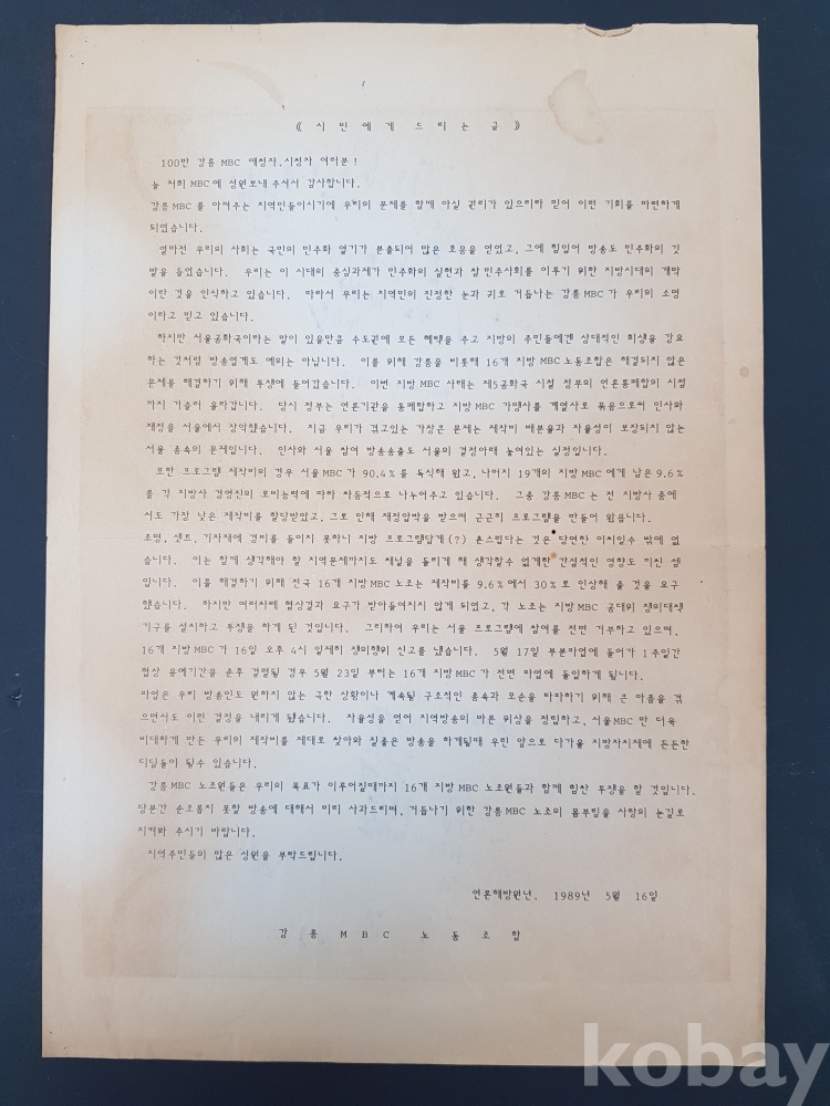 **** 시민에게 드리는 글/강릉 MBC 노동조합/1989.5.16