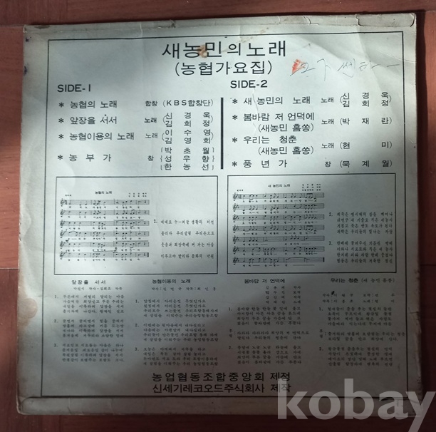 쟈켓과 음반 세월에 비해 아주 좋은것 같읍니다. 사진을 아주 여러장 올렸으니 자세히 봐 주시시 바랍니다. 옛날 60년대 농협 초창기때 농협중앙회에서 제작했던것으로 보여집니다. 스테레오가 아닌 롱 플레인 점도 그렇고.. 이젠 거의 사라진 골동반입니다. 참 올드합니다. 저는 그냥 수집만 하다보니 짐스러워 정리차원에서 올립니다 계속 올리려고 하는 만큼 지켜 봐 주시고.